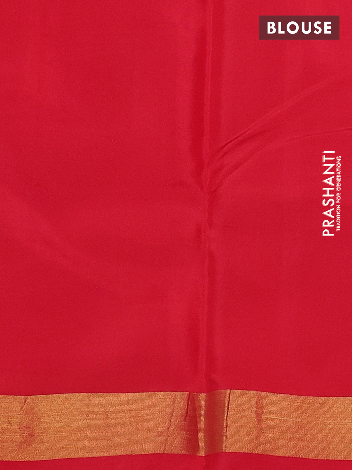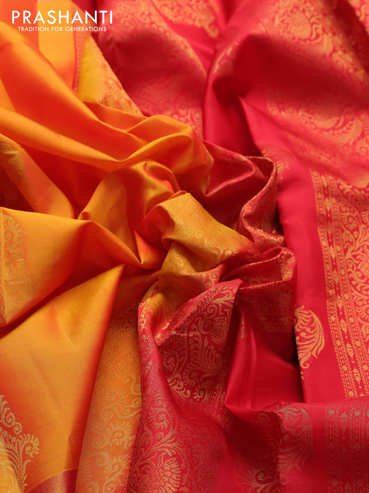 Kanchipuram silk saree mustard yellow and red with zari woven buttas and zari woven butta border