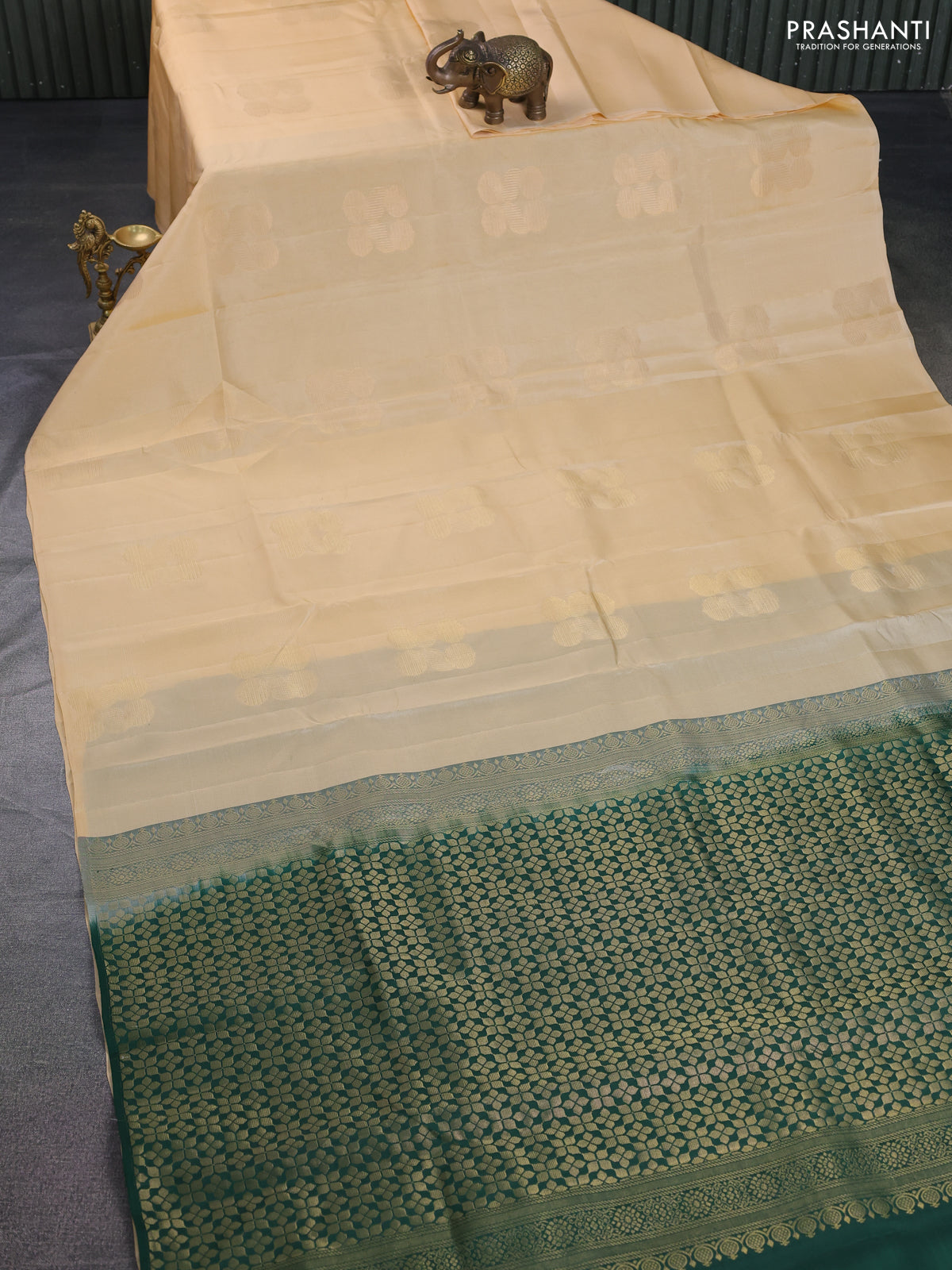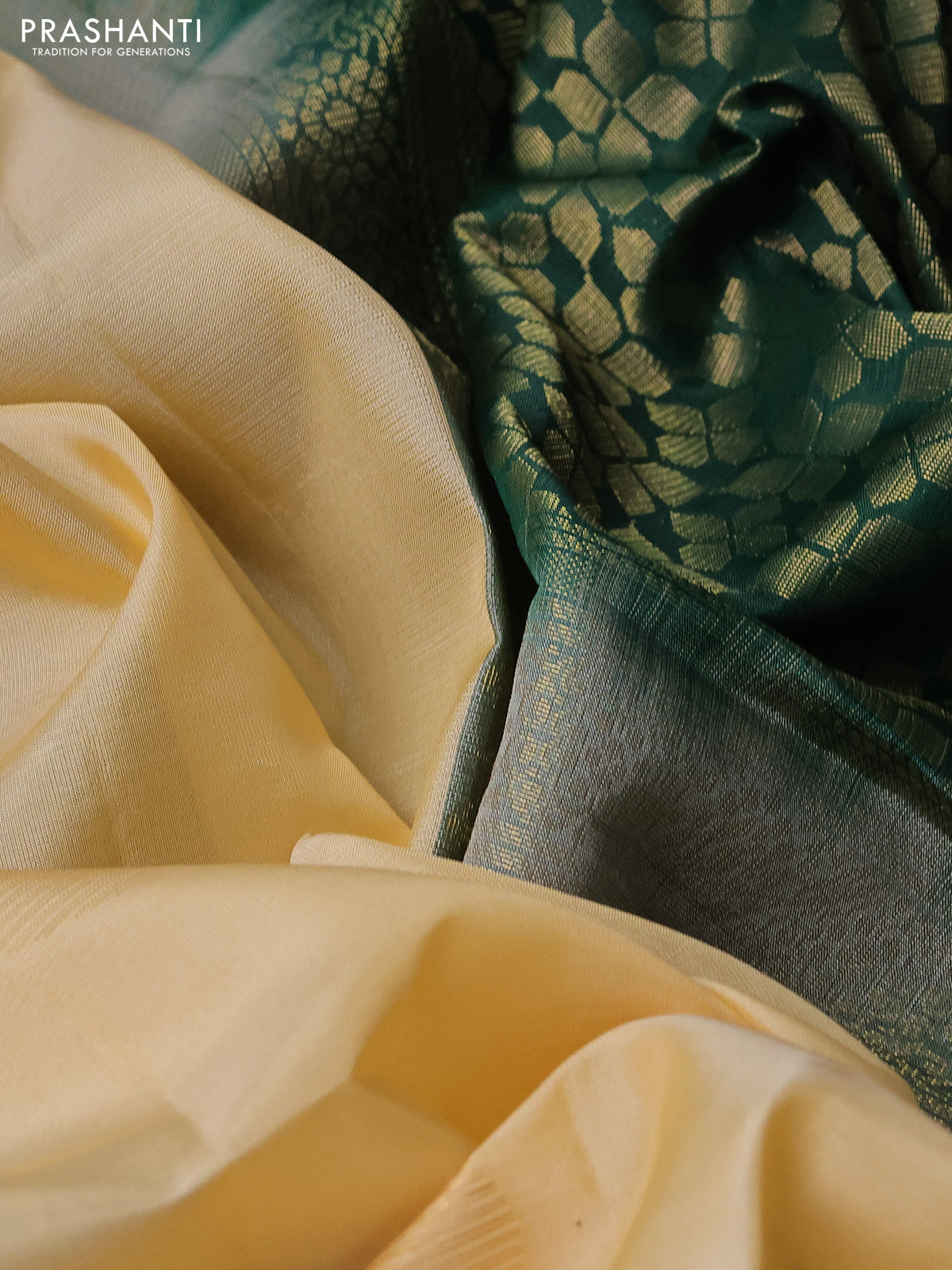 Kanchipuram silk saree pale yellow and green with zari woven buttas in borderless style