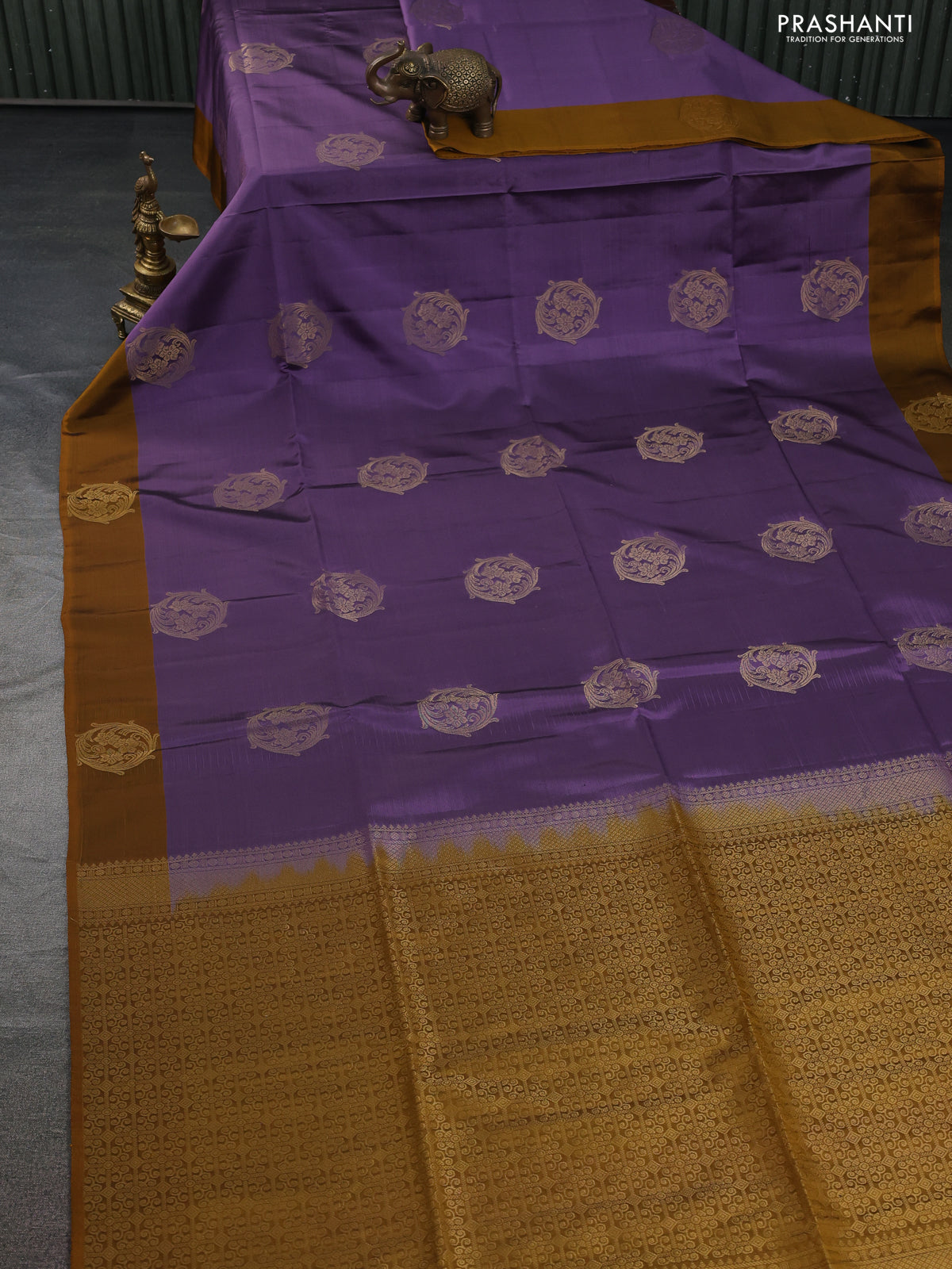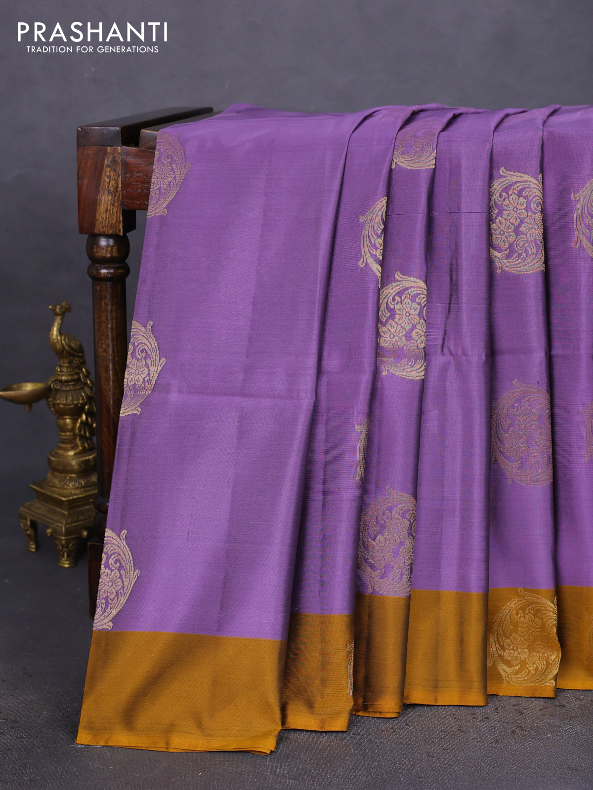Kanchipuram soft silk saree pastel purple and dark mustard with zari woven buttas and zari woven butta border