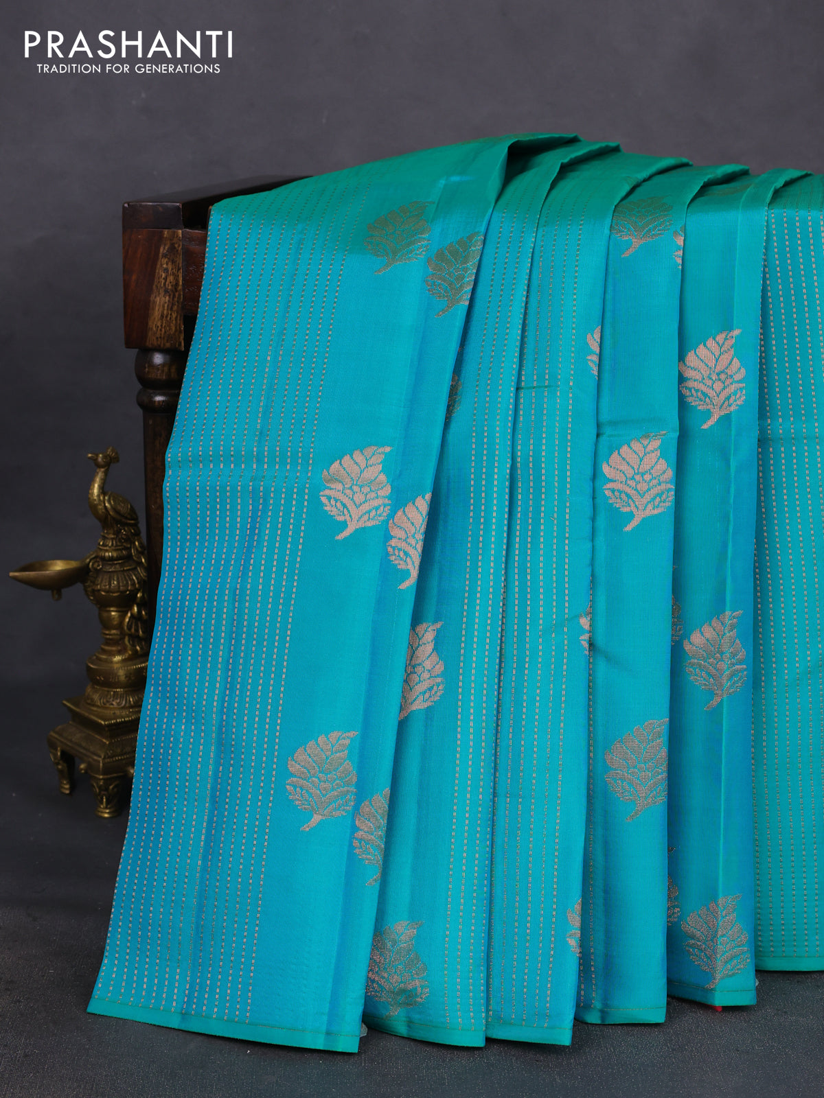 Kanchipuram silk saree pastel purple and green with allover copper zari weaves in borderless style