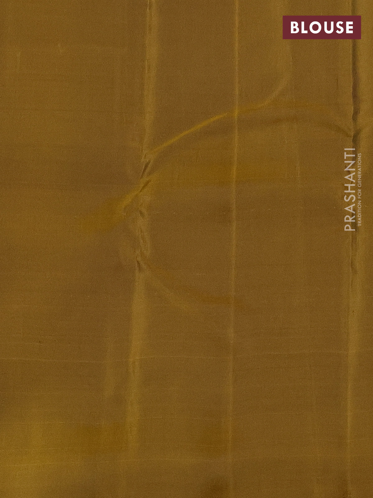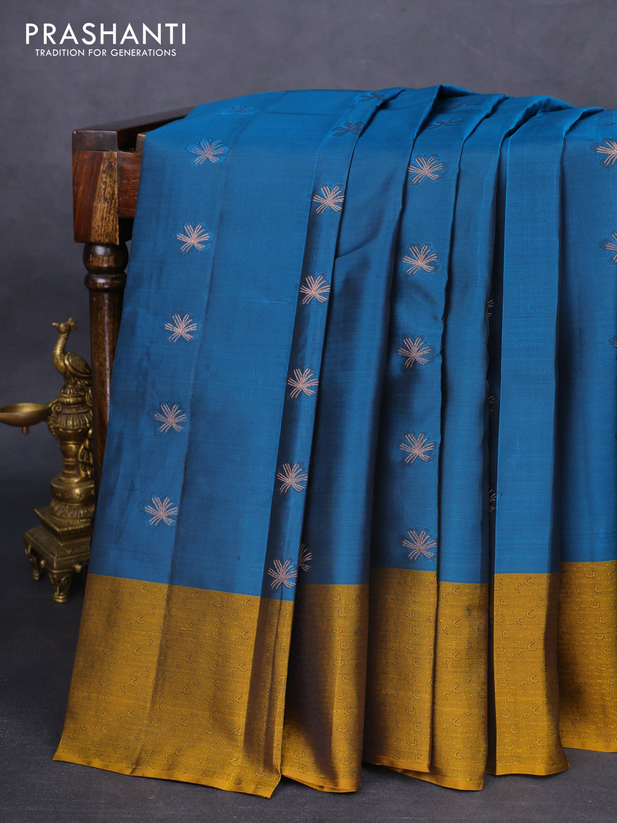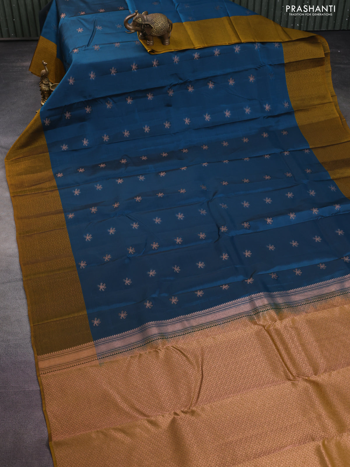 Kanchipuram silk saree peacock blue and dark mustard with zari woven buttas and self emboss border