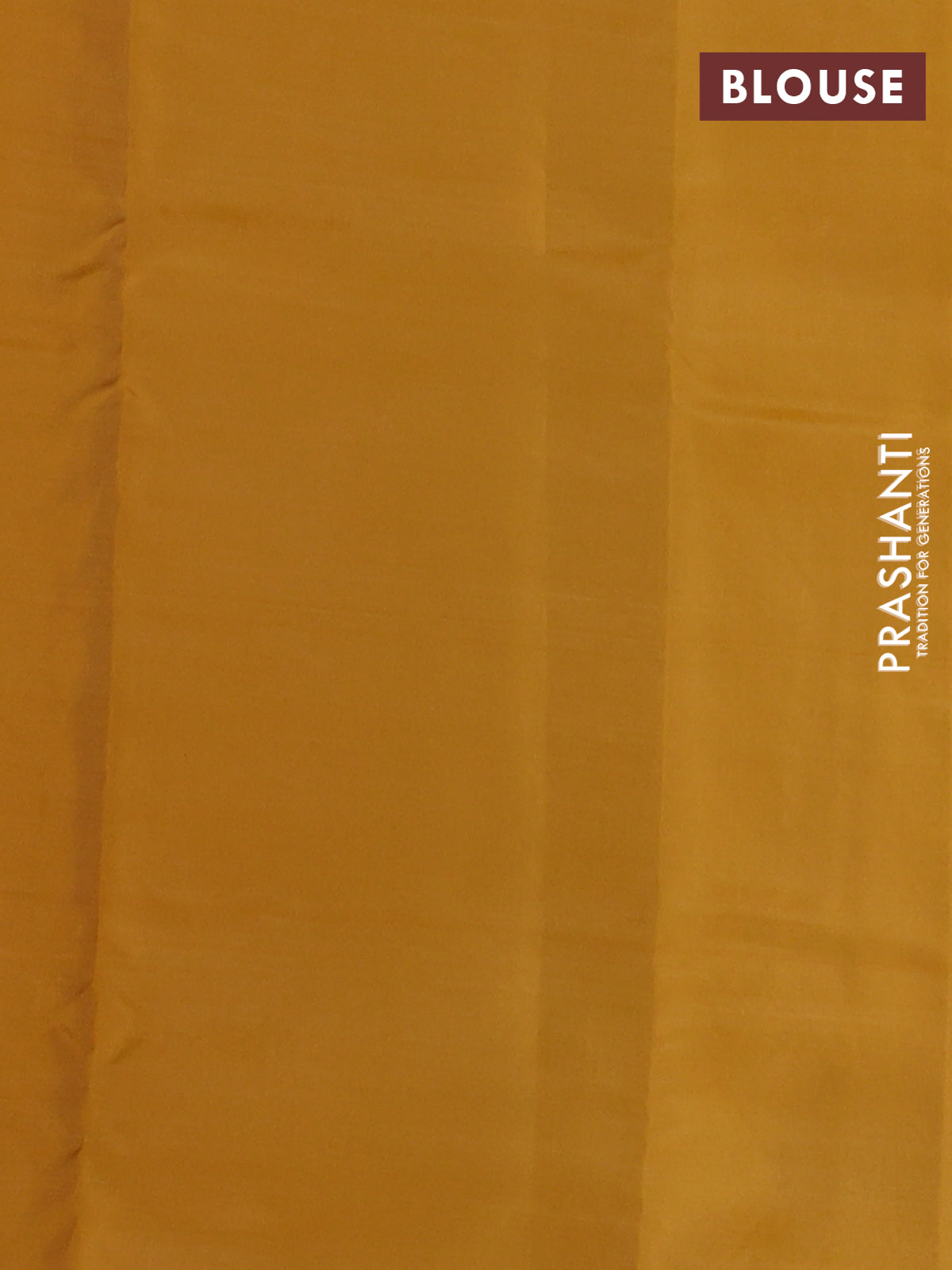 Kanchipuram silk saree peacock blue and mustard yellow with copper zari woven buttas in borderless style