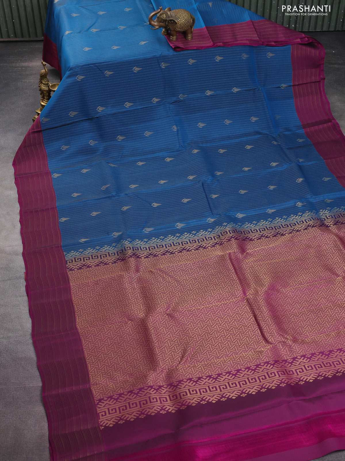 Kanchipuram silk saree peacock blue and purple with allover zari weaves and zari woven border