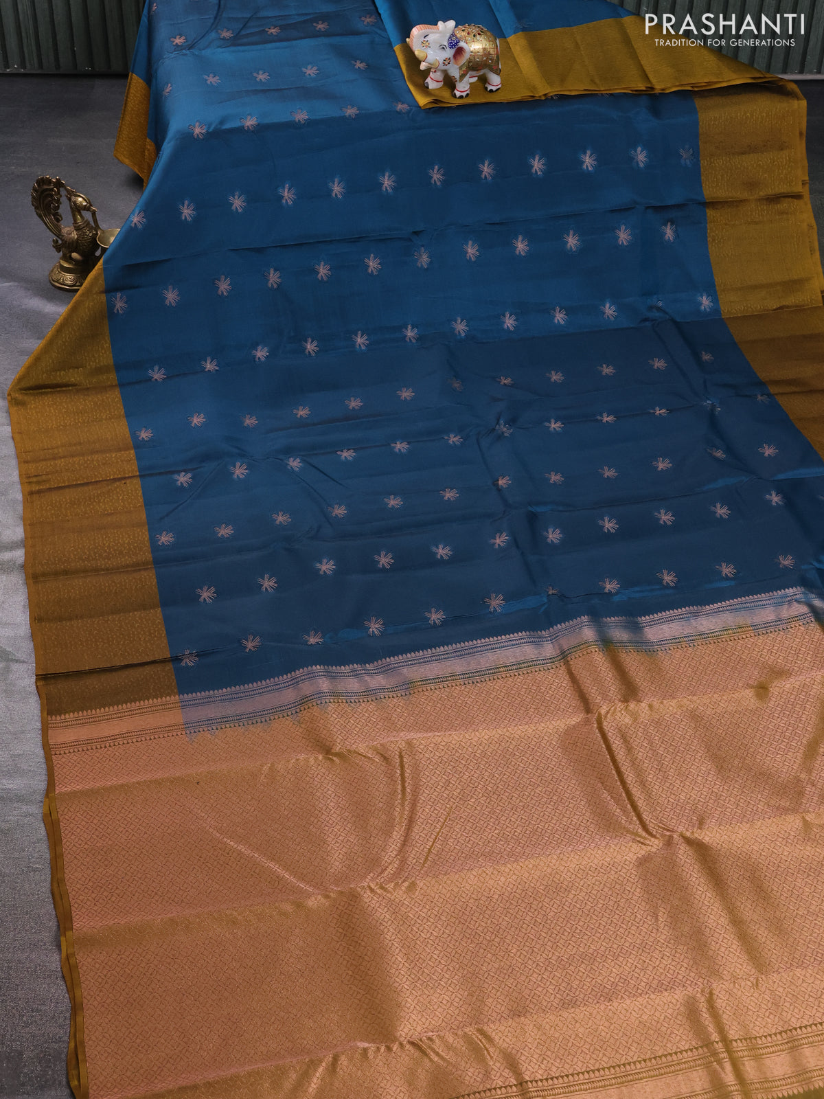 Kanchipuram silk saree peacock green and mustard shade with zari woven buttas and self emboss border