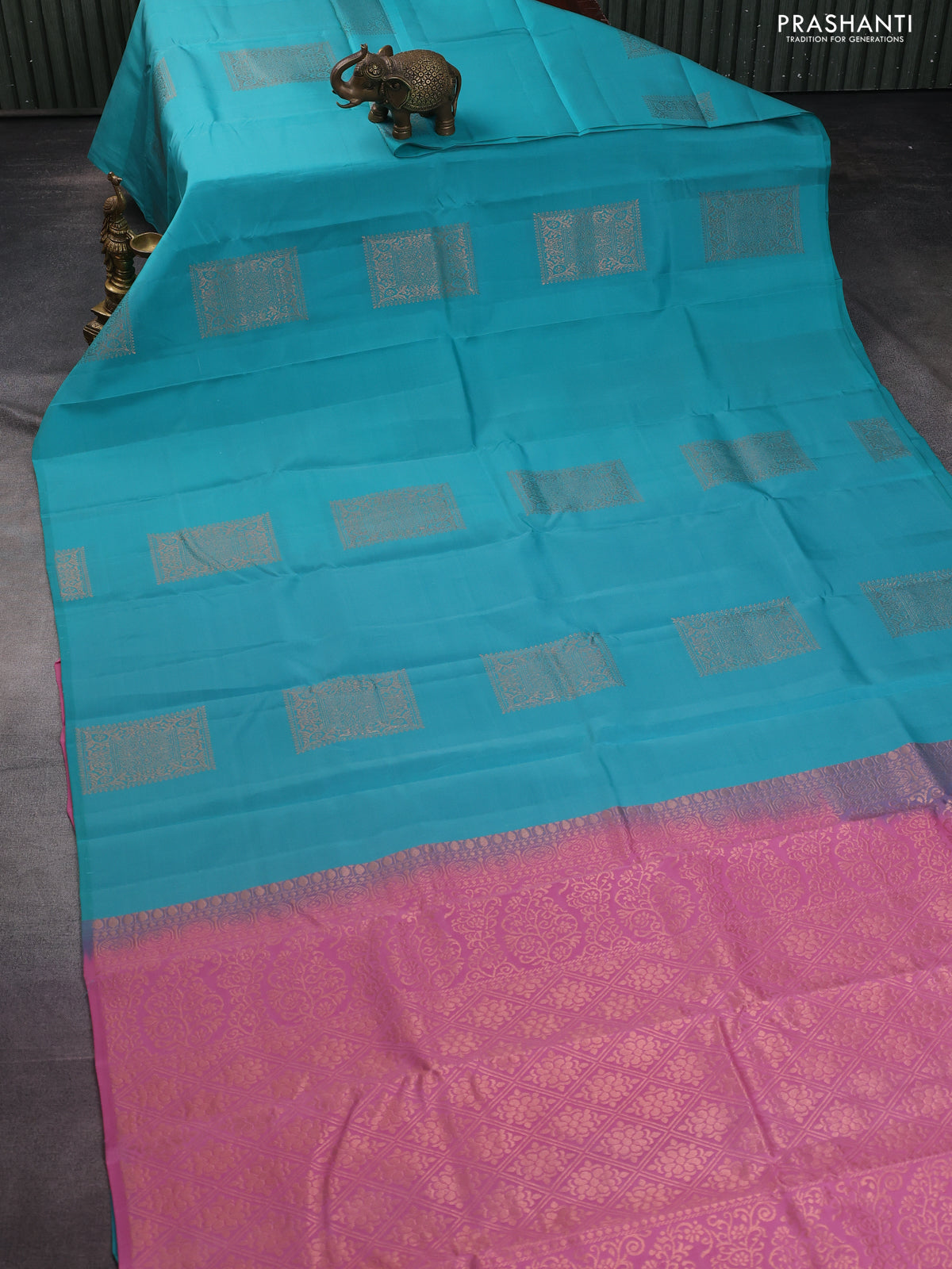 Kanchipuram silk saree teal blue and light pink with zari woven buttas in borderless style