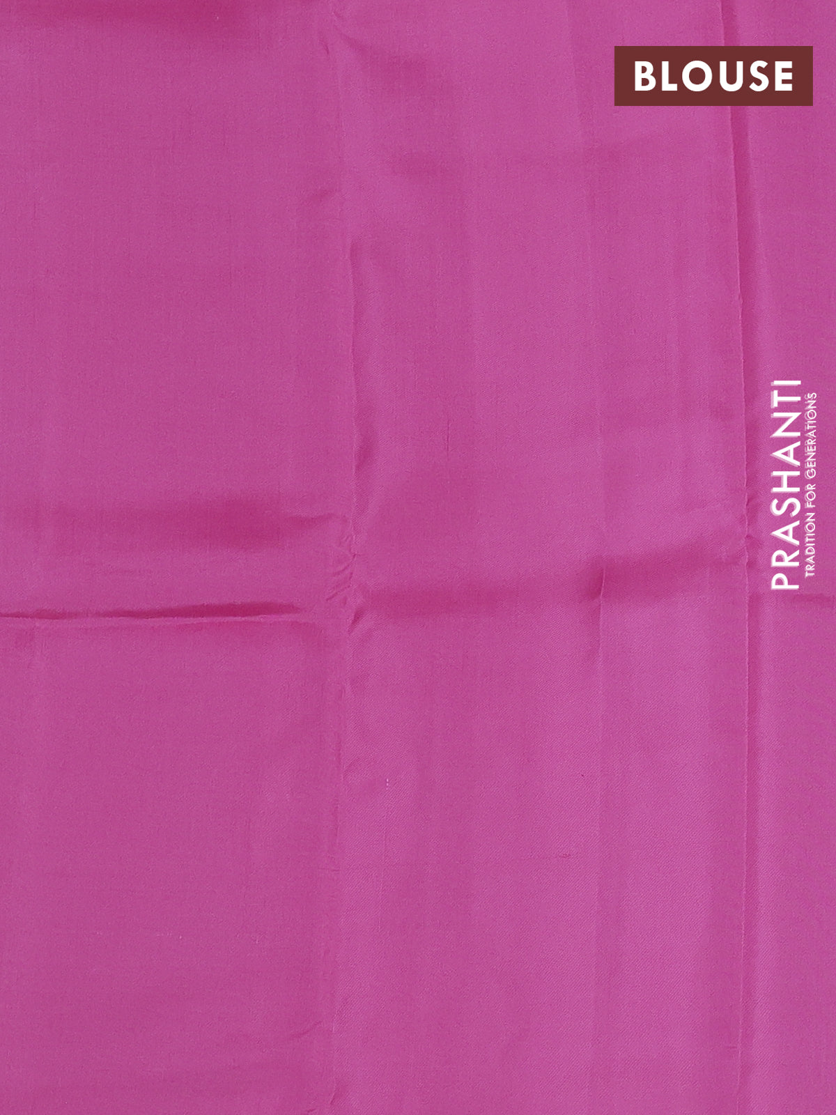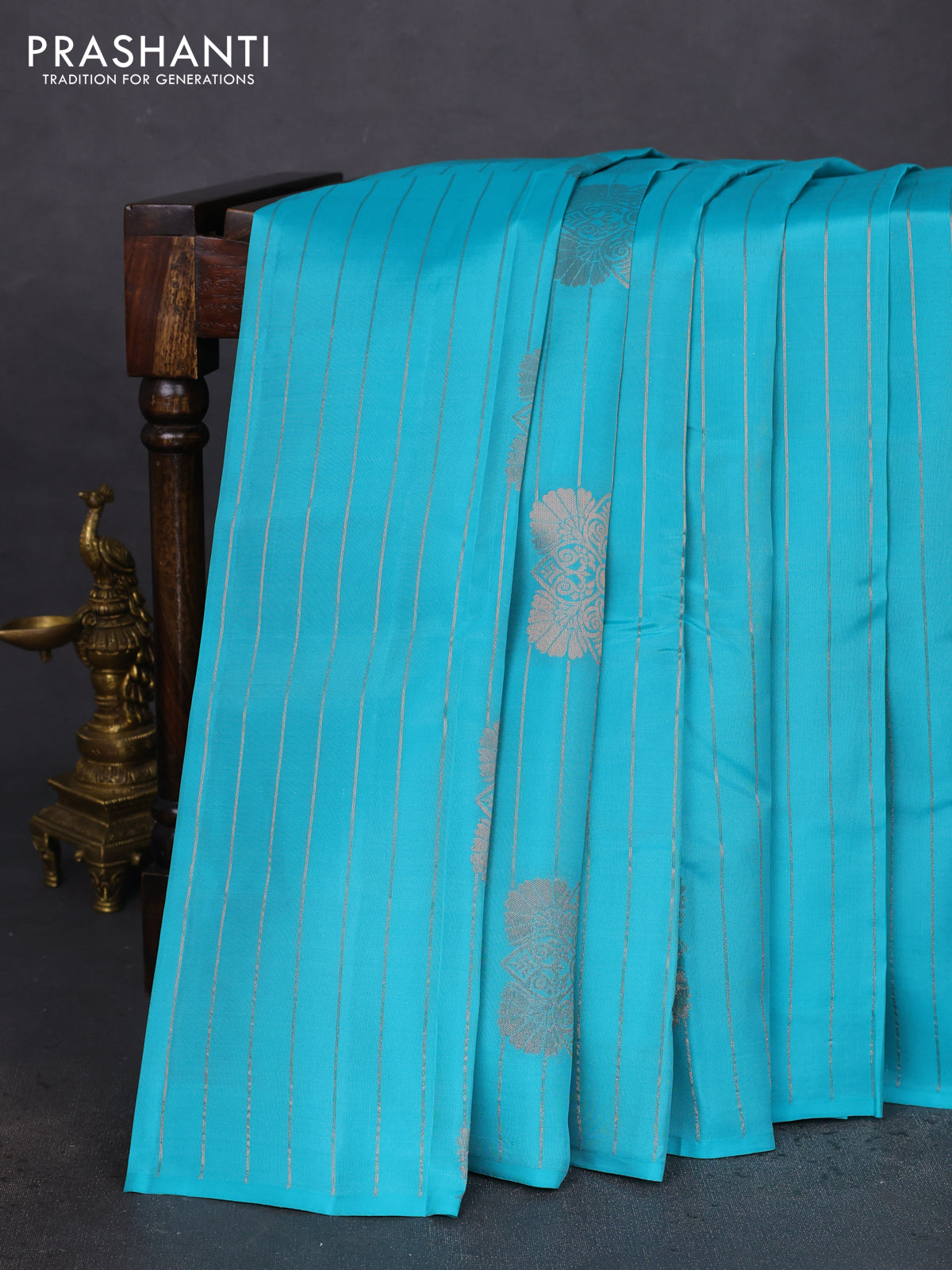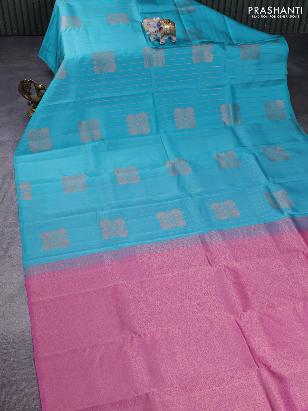 Kanchipuram silk saree teal blue and pink with allover copper zari weaves & buttas in borderless style
