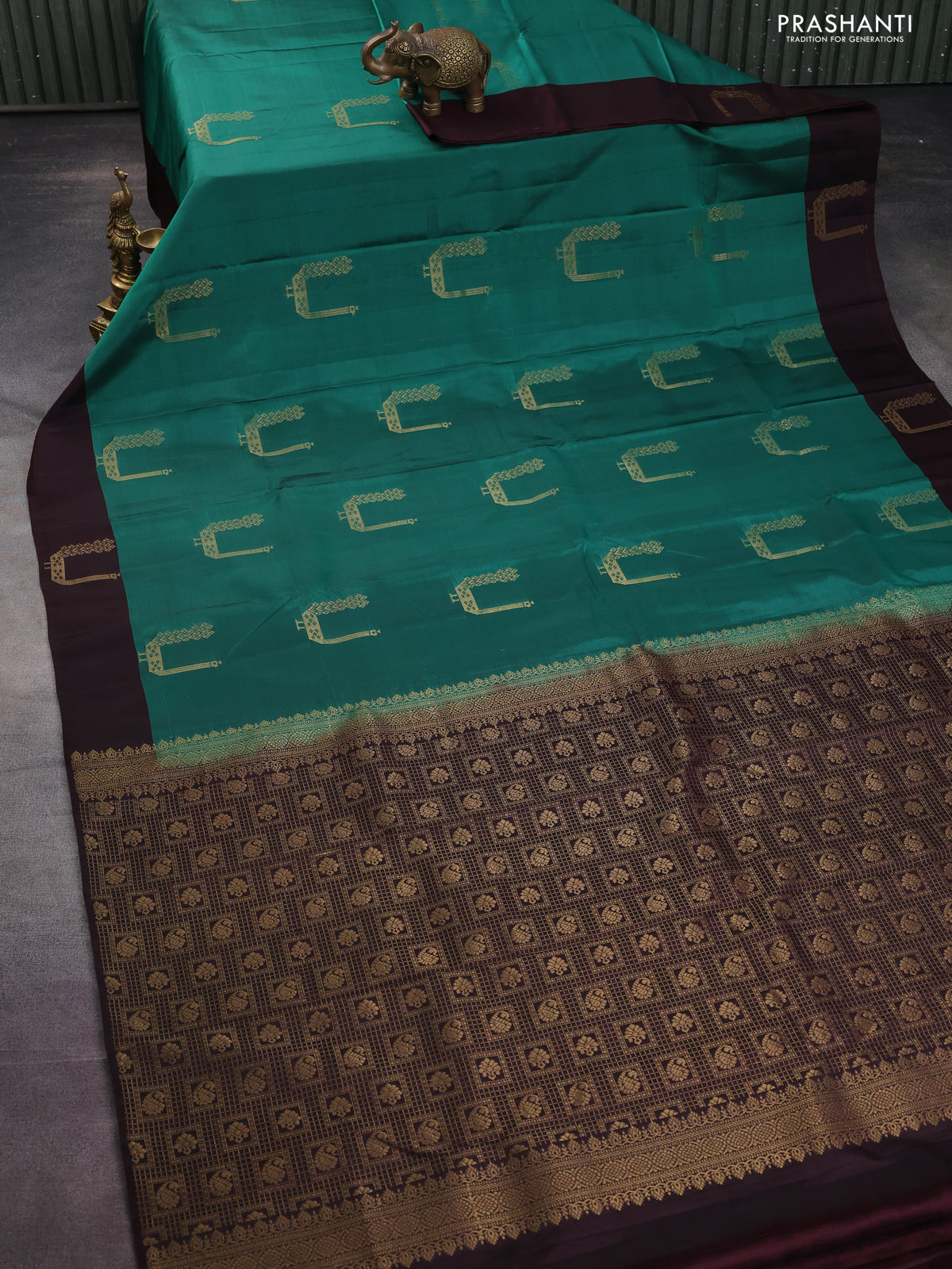 Kanchipuram silk saree teal green and brown with zari woven buttas and zari woven butta border
