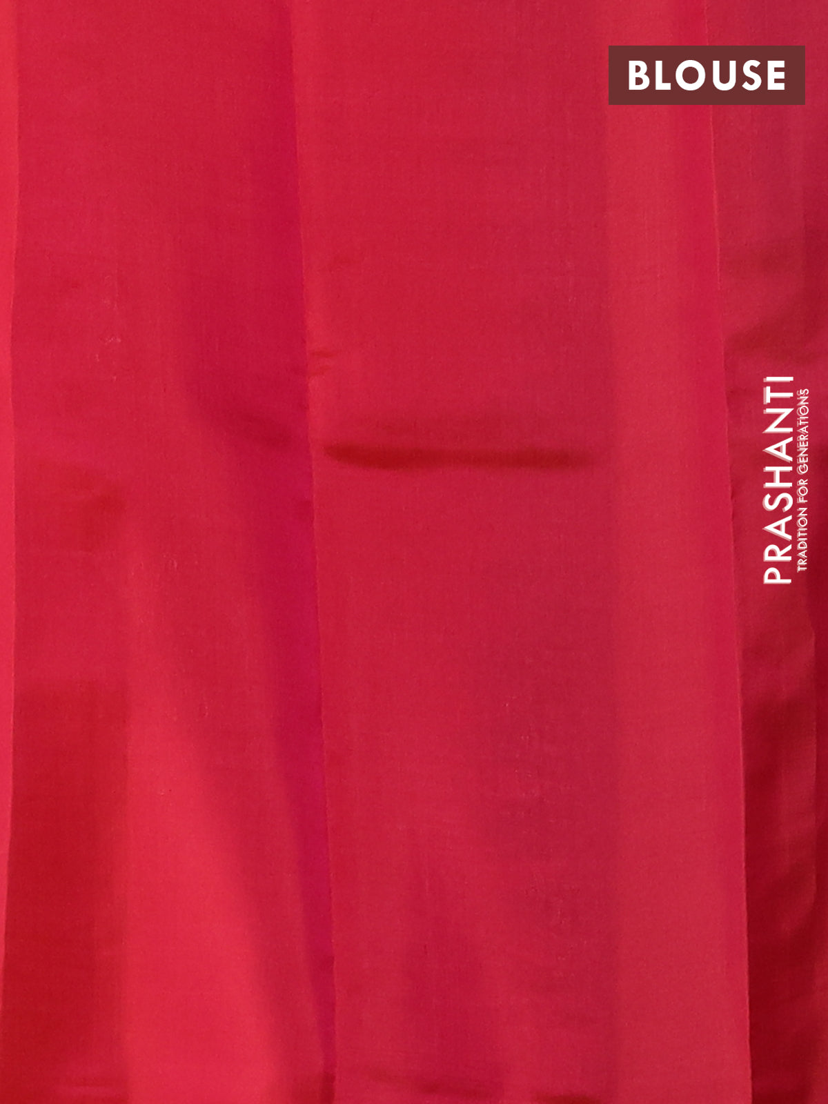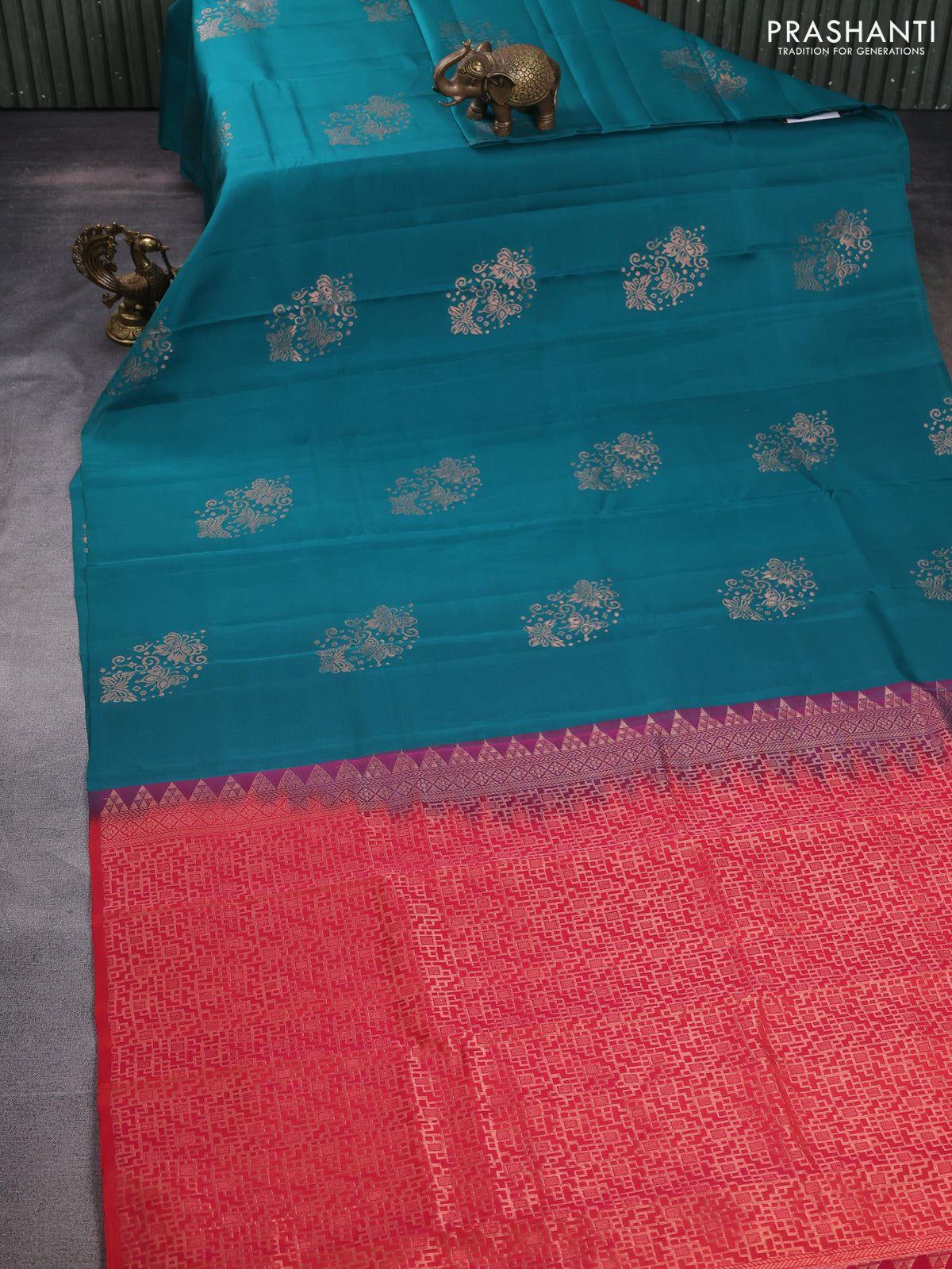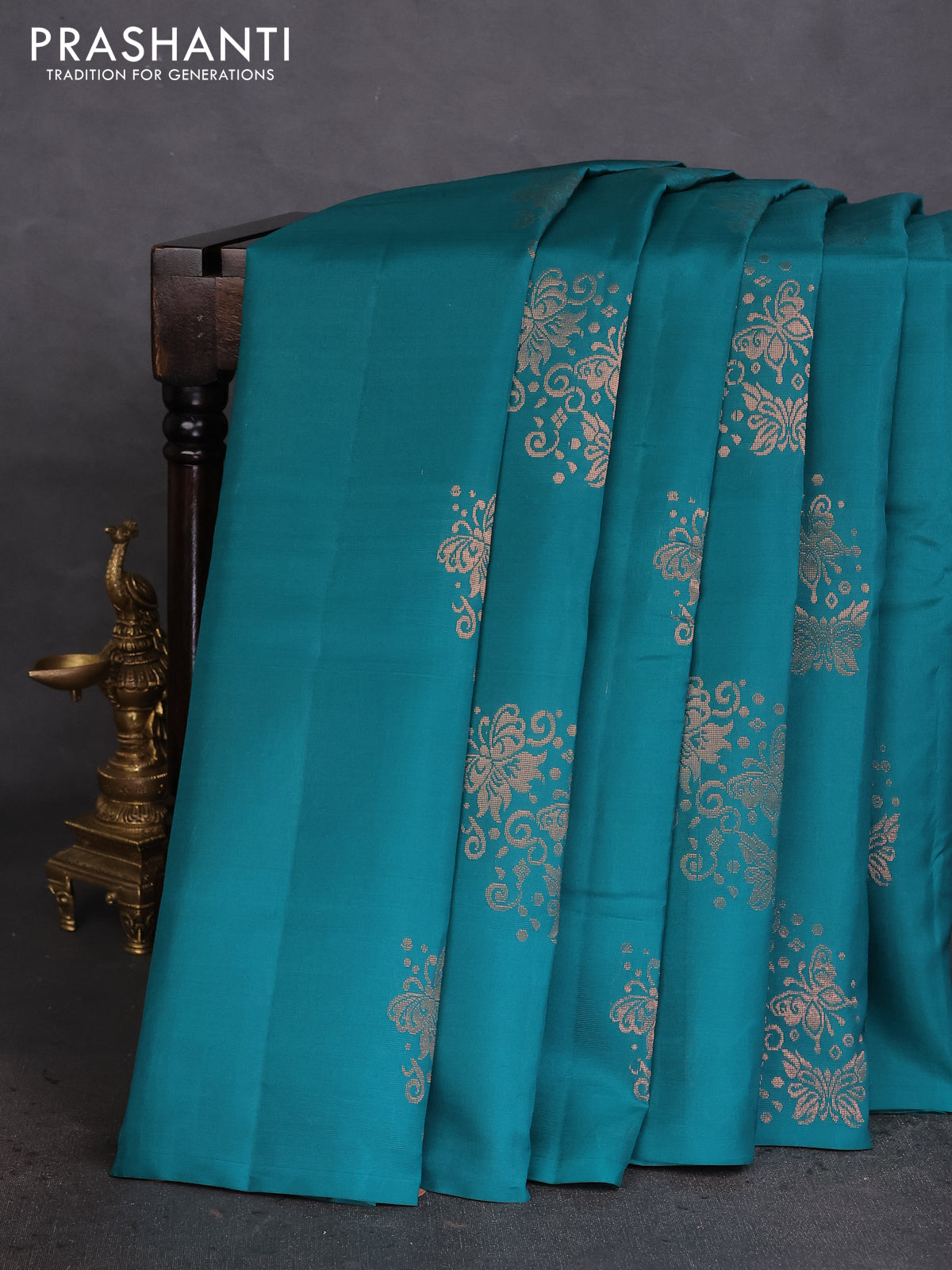 Kanchipuram silk saree teal green and pinksh orange with copper zari woven buttas in borderless style