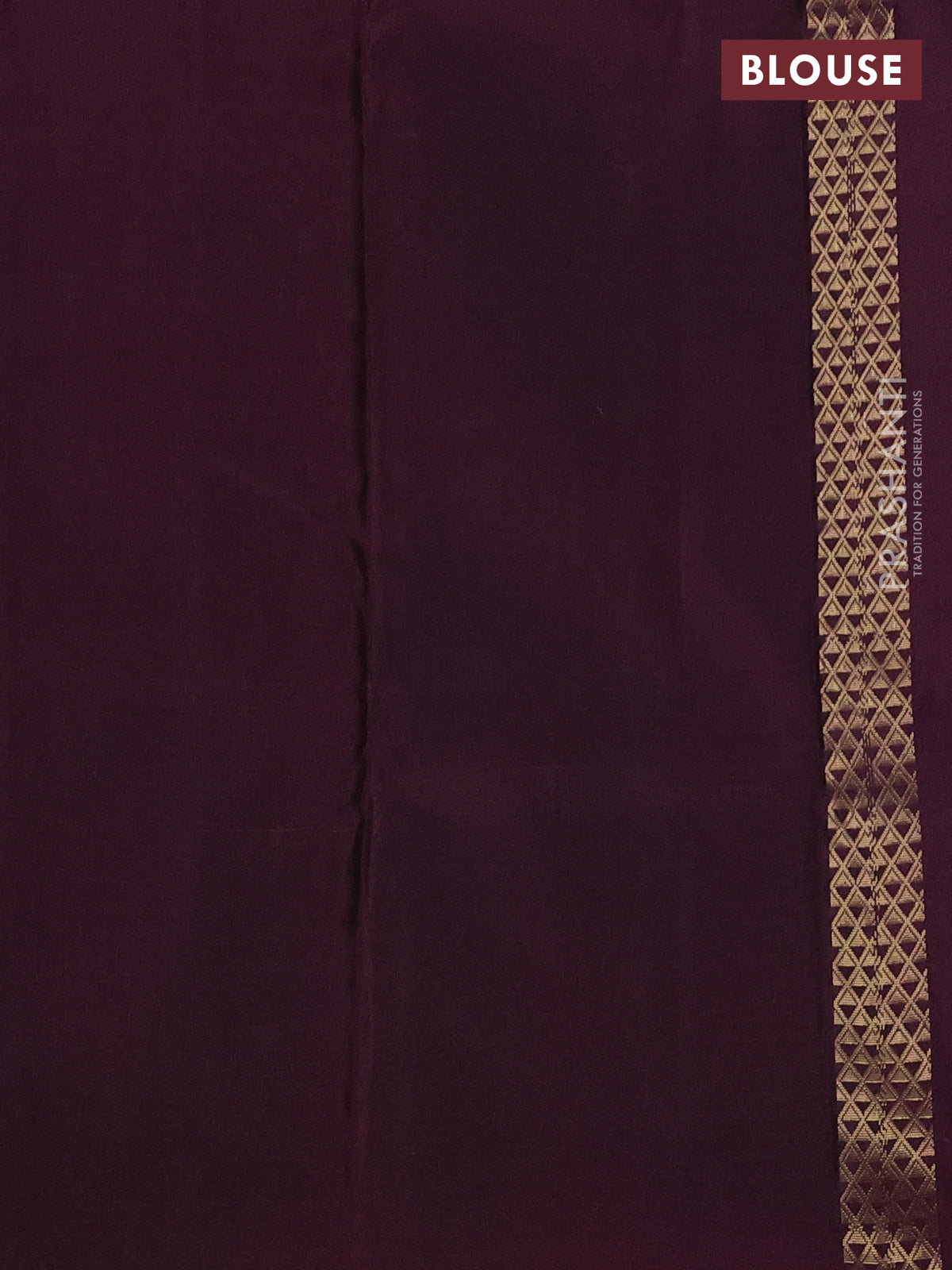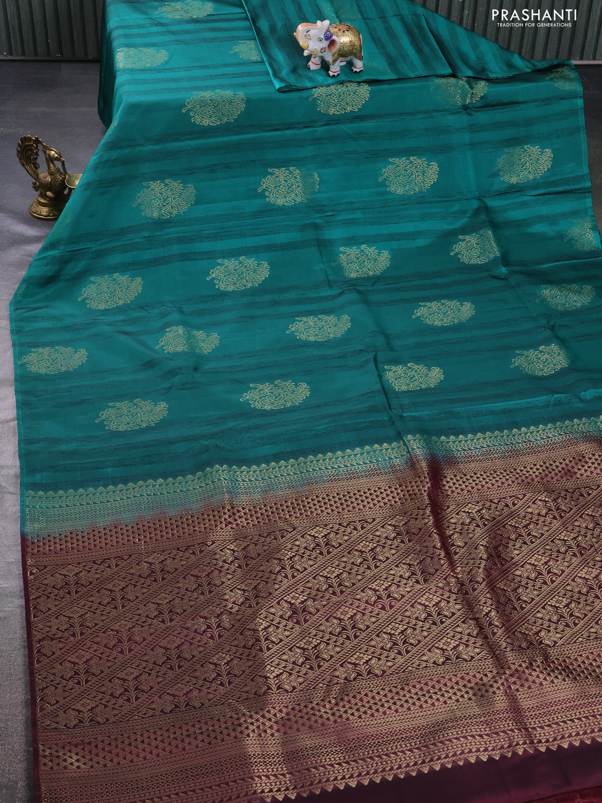 Kanchipuram silk saree teal green and wine shade with zari woven buttas & jute finish in borderless style