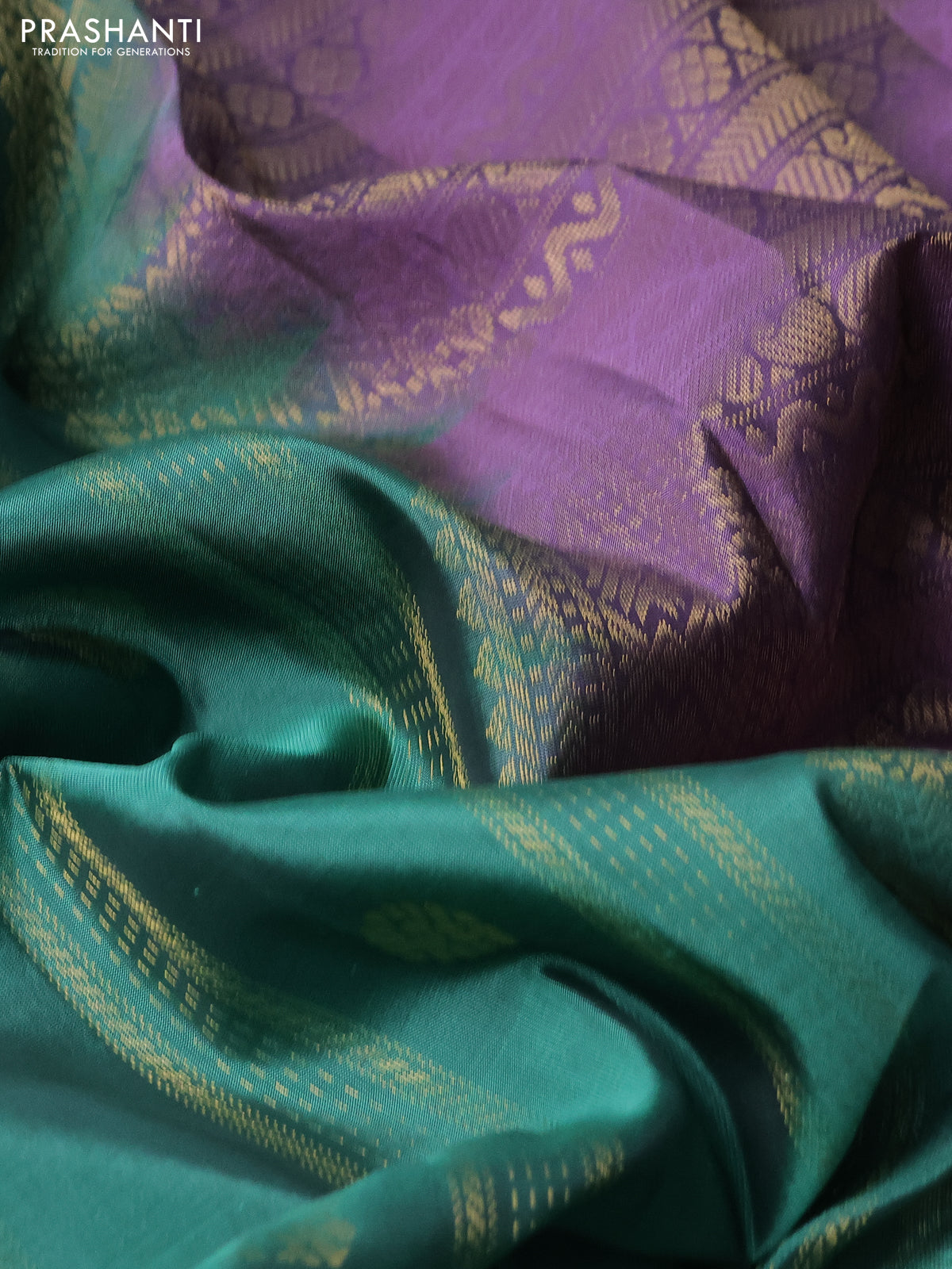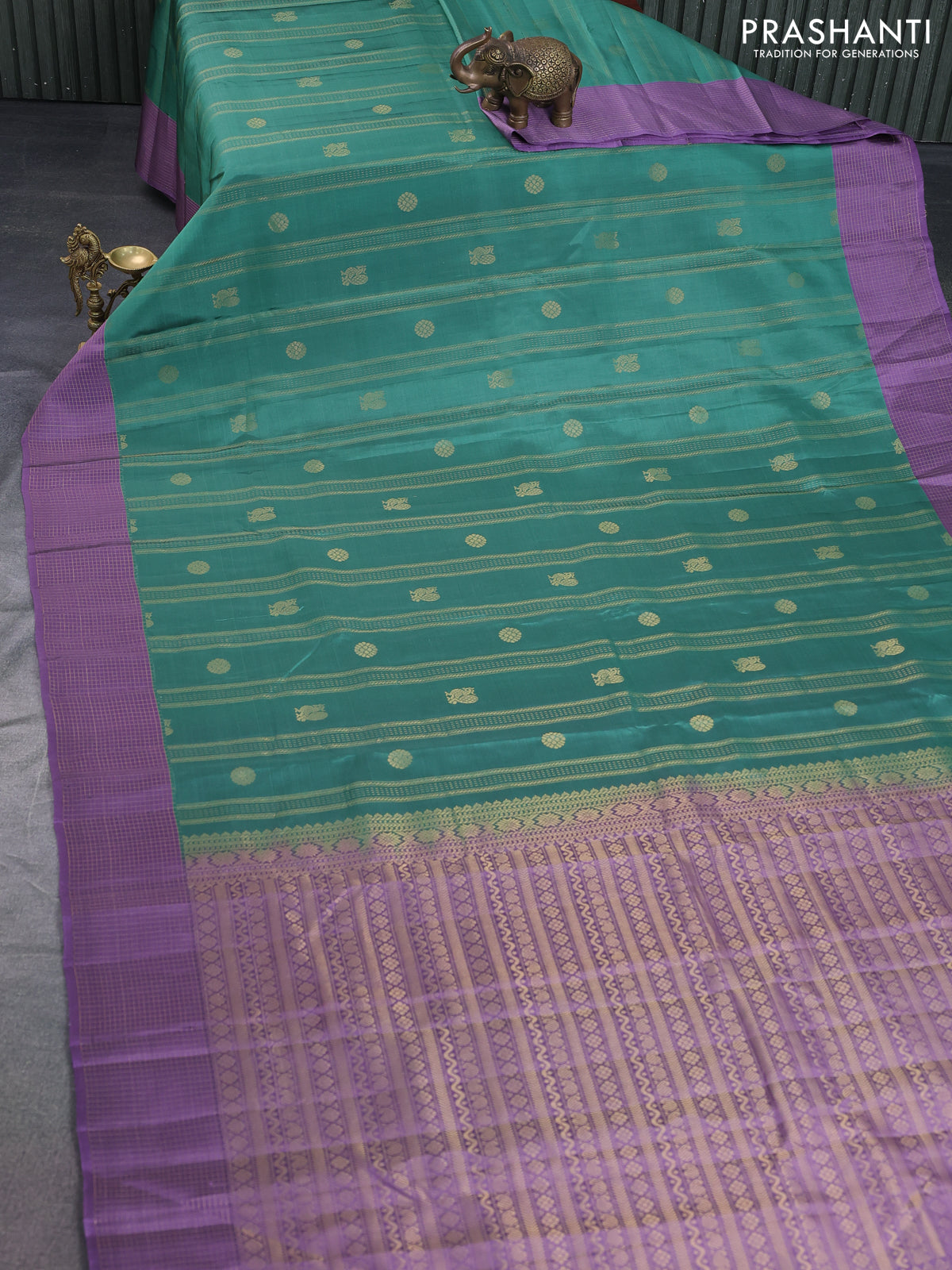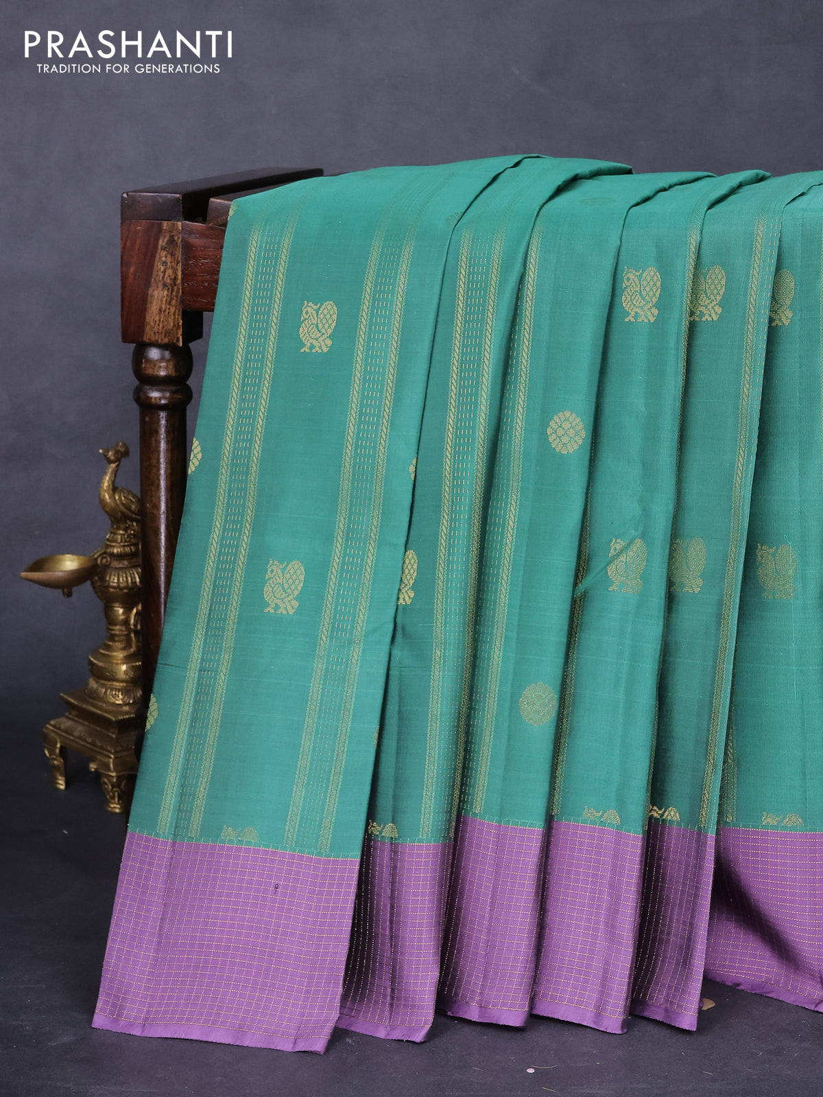 Kanchipuram silk saree teal green shade and pastel purple with allover zari weaves & buttas and zari woven checked border