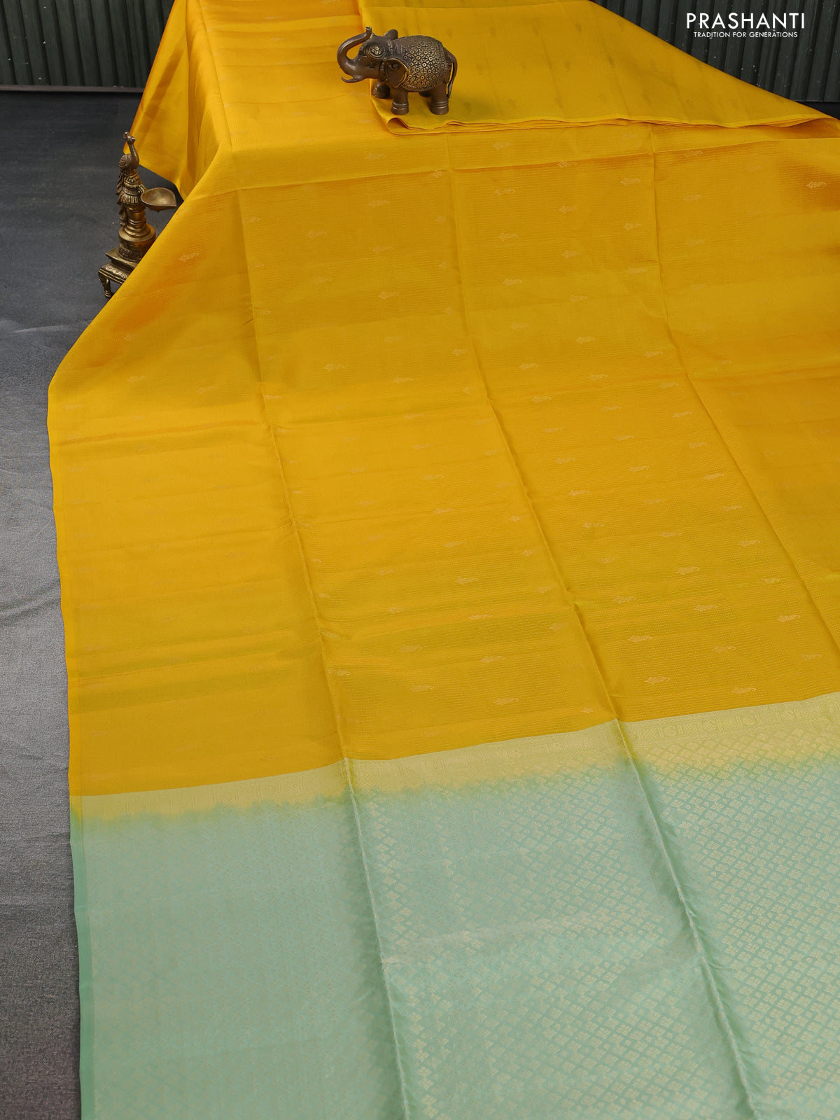 Kanchipuram soft silk saree yellow and pastel green with allover zari weaves in borderless style