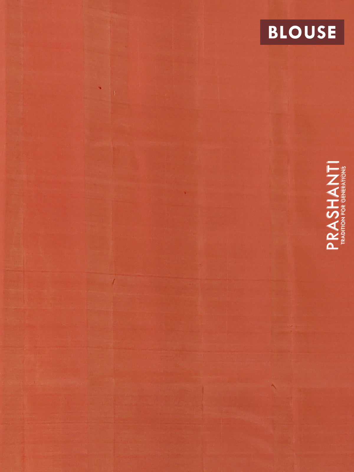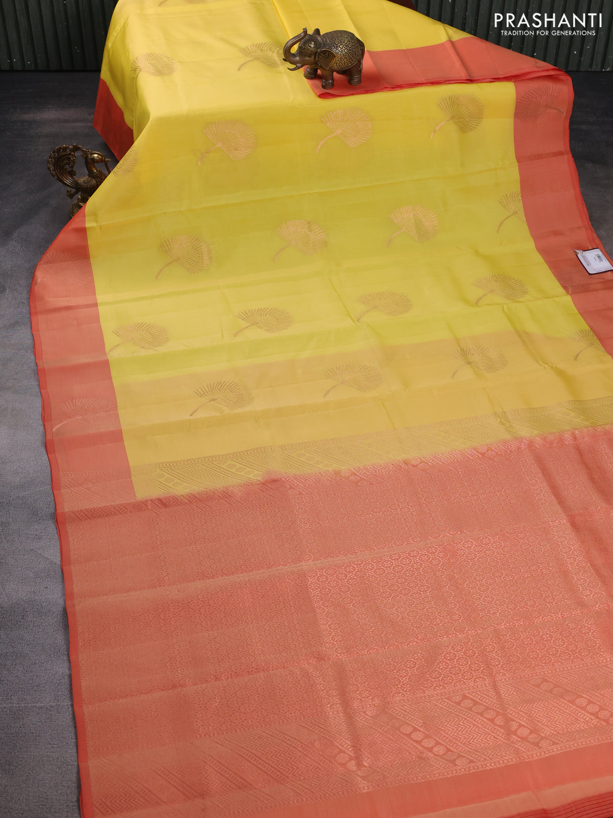 Kanchipuram silk saree yellow and peach orange with copper zari woven buttas and copper zari woven butta border