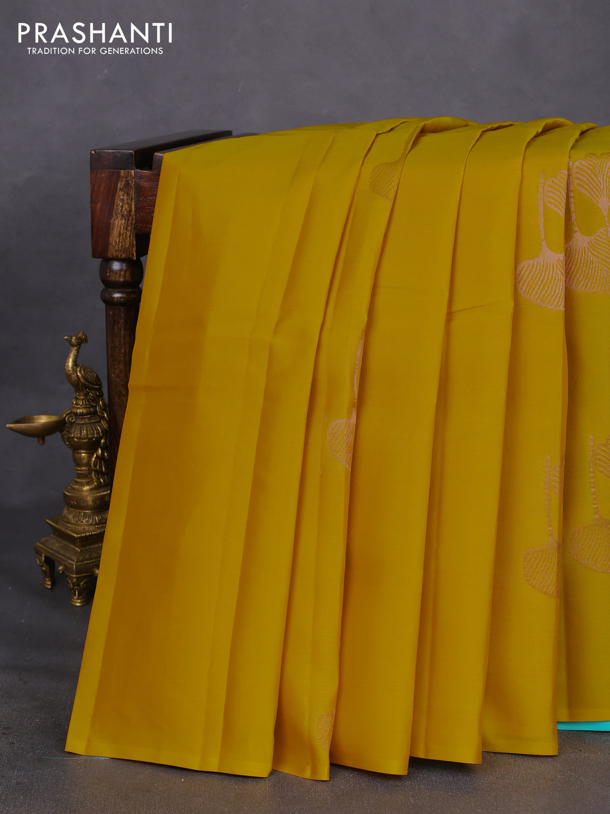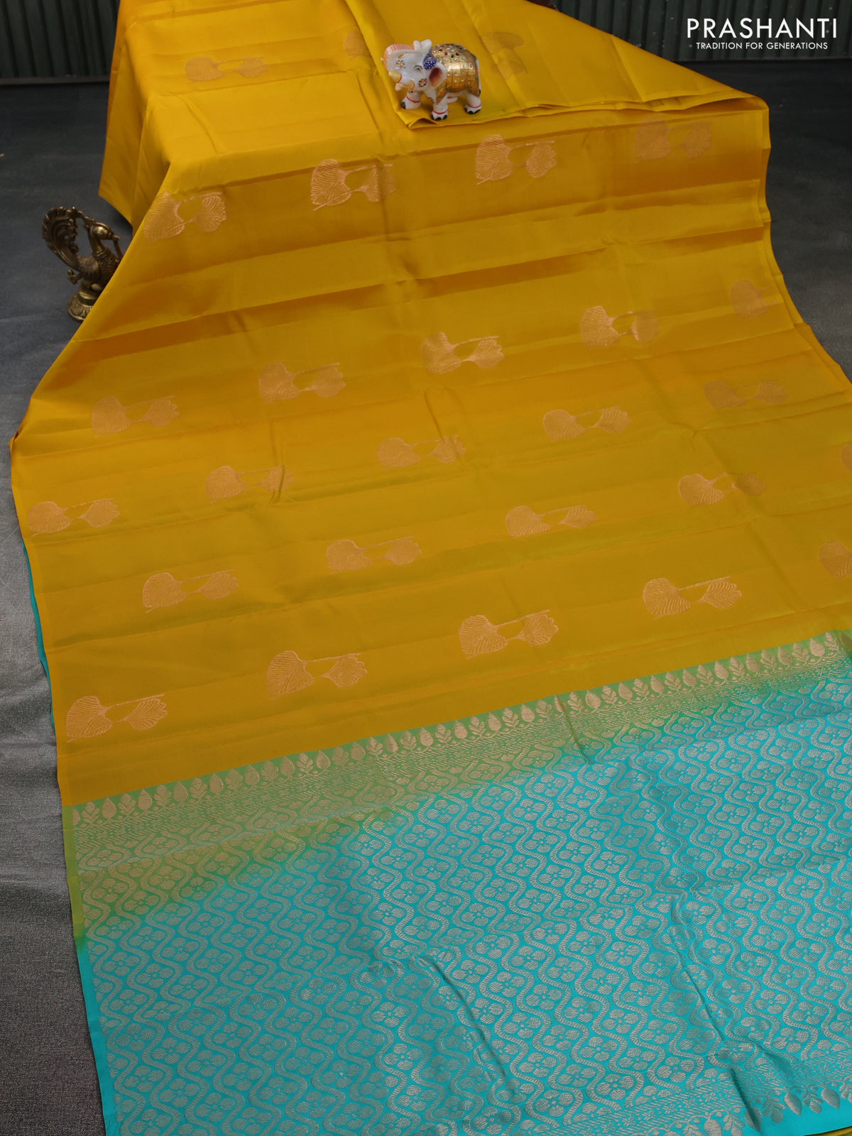 Kanchipuram silk saree yellow and teal blue with copper zari woven buttas in borderless style