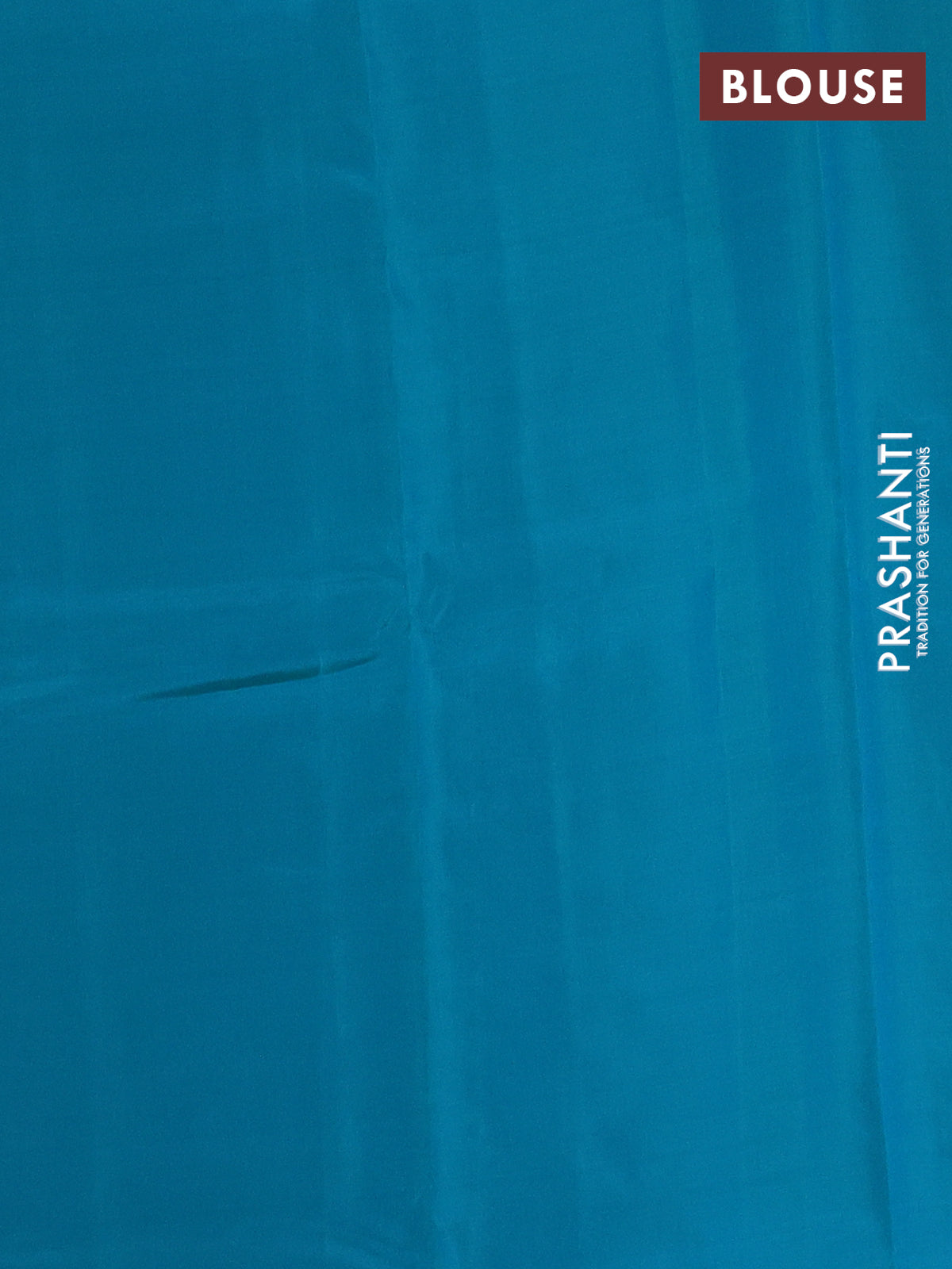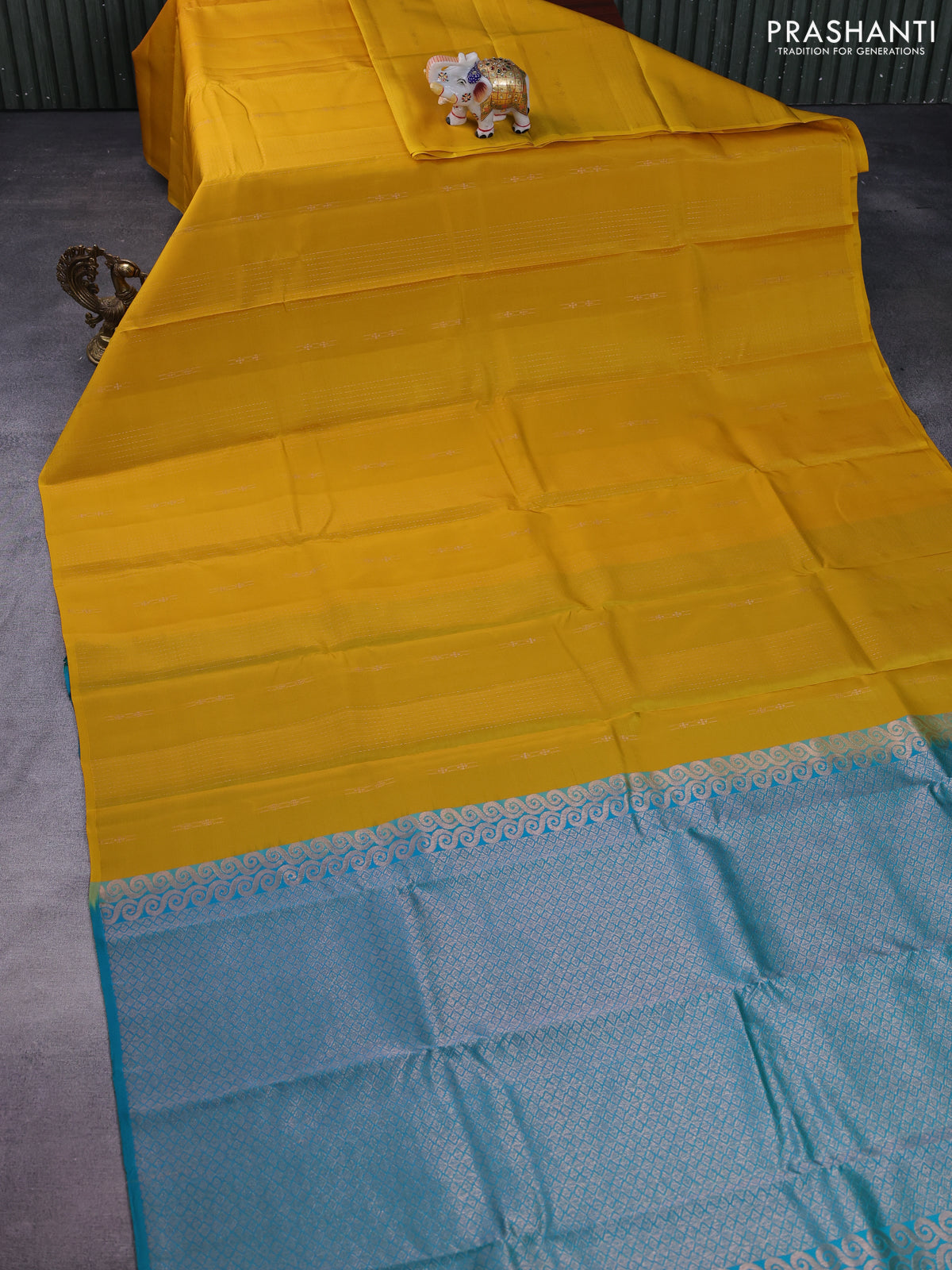 Kanchipuram silk saree yellow and teal green with allover copper zari weaves & buttas in borderless style