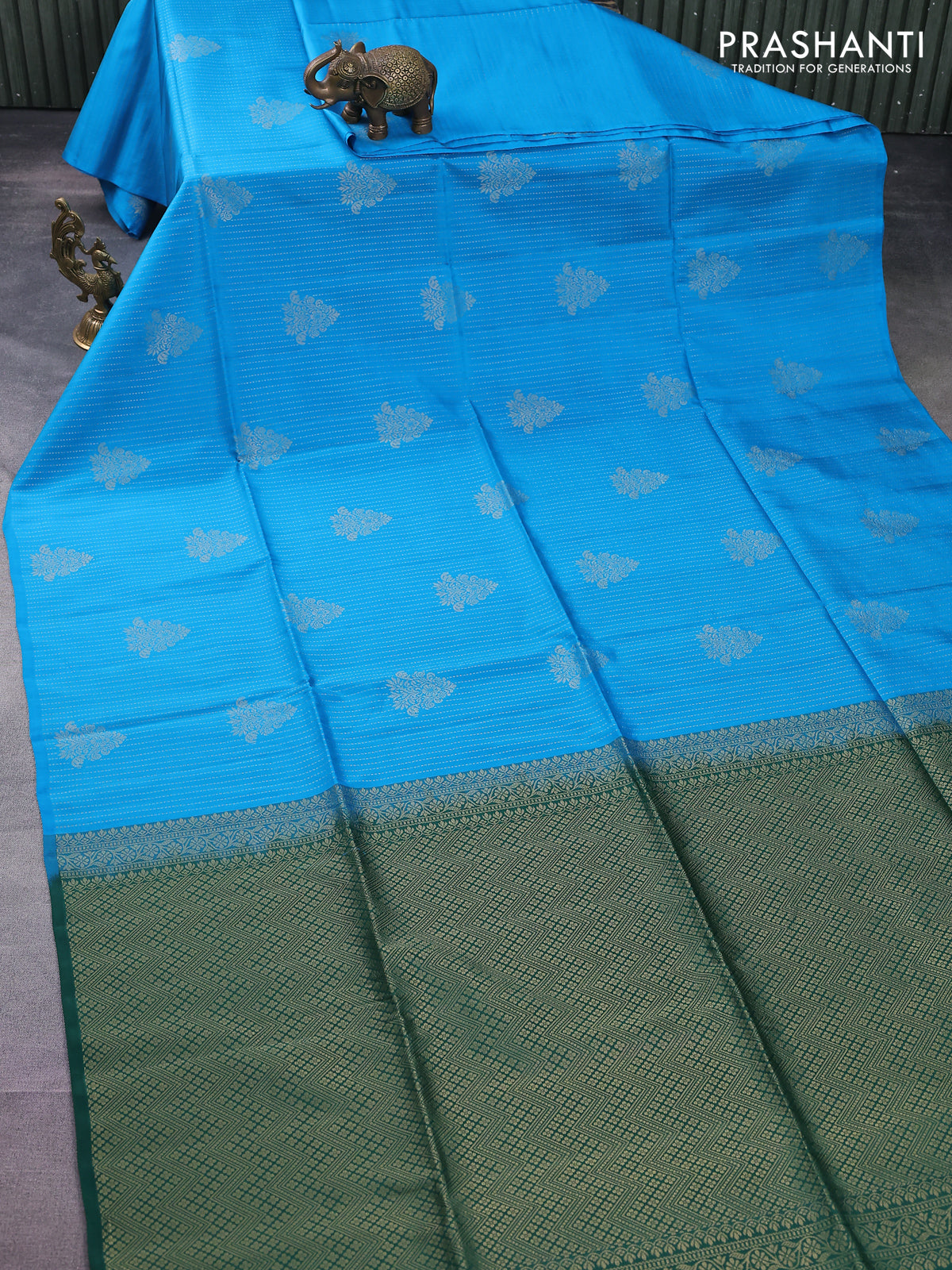 Kanchipuram soft silk saree cs blue and dark green with allover zari weaves & buttas in borderless style