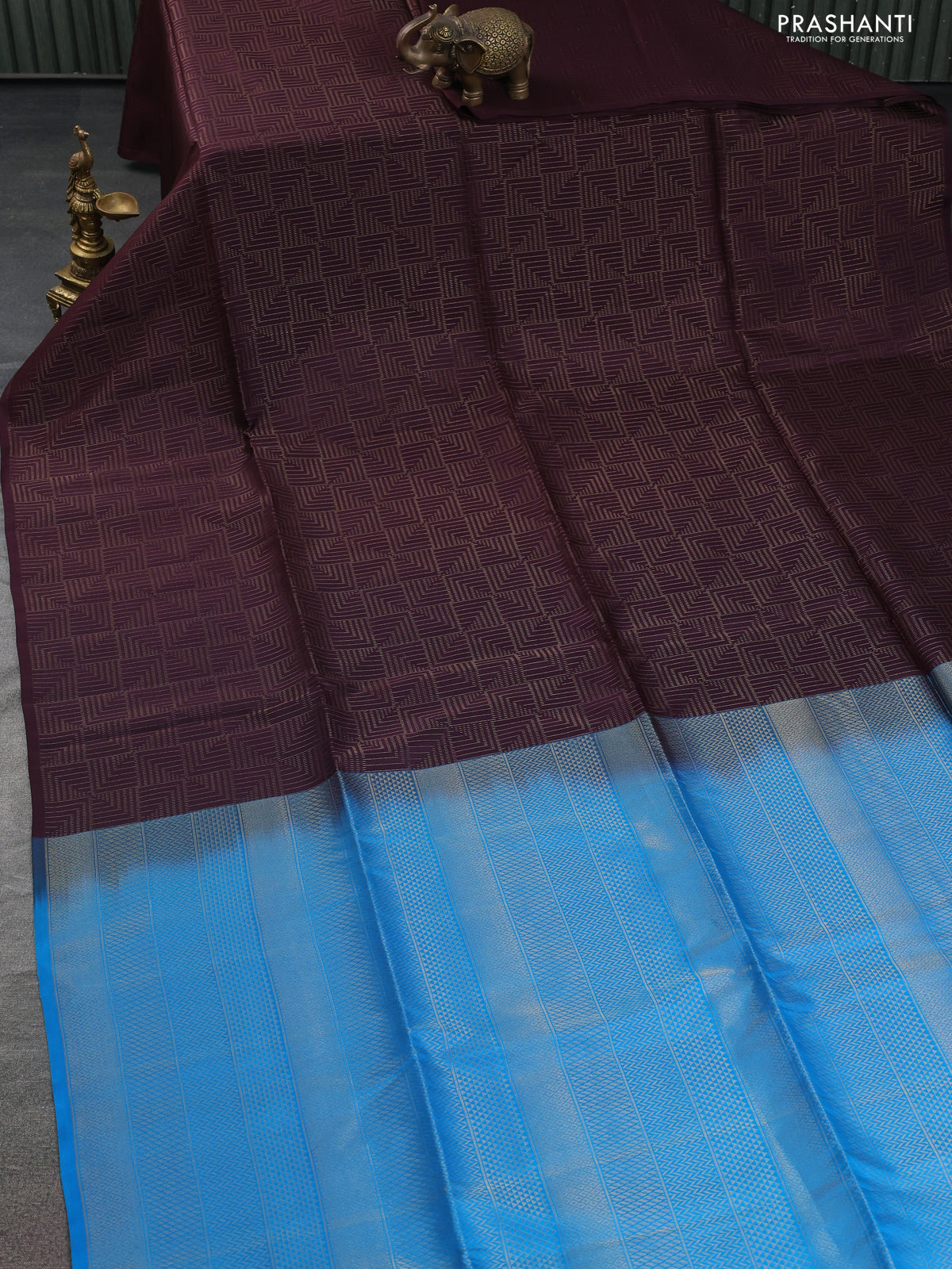 Kanchipuram soft silk saree deep wine shade and cs blue with allover zari weaves in borderless style