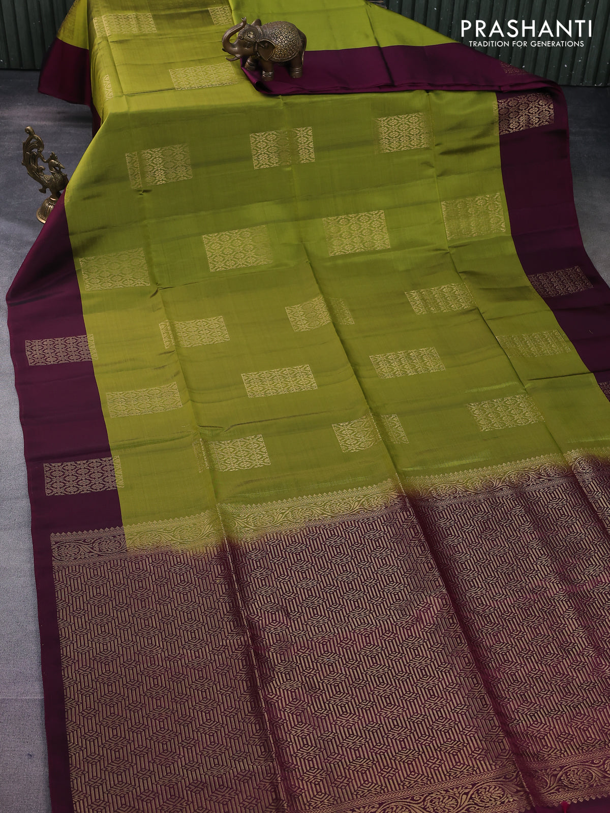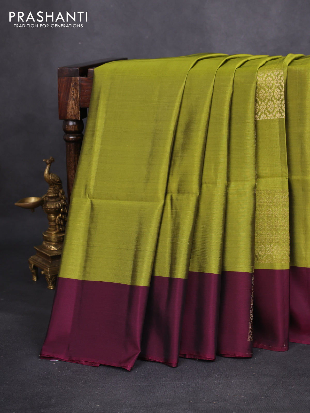Kanchipuram soft silk saree mehendi green and dark magenta pink with zari woven geometric buttas and zari woven butta border