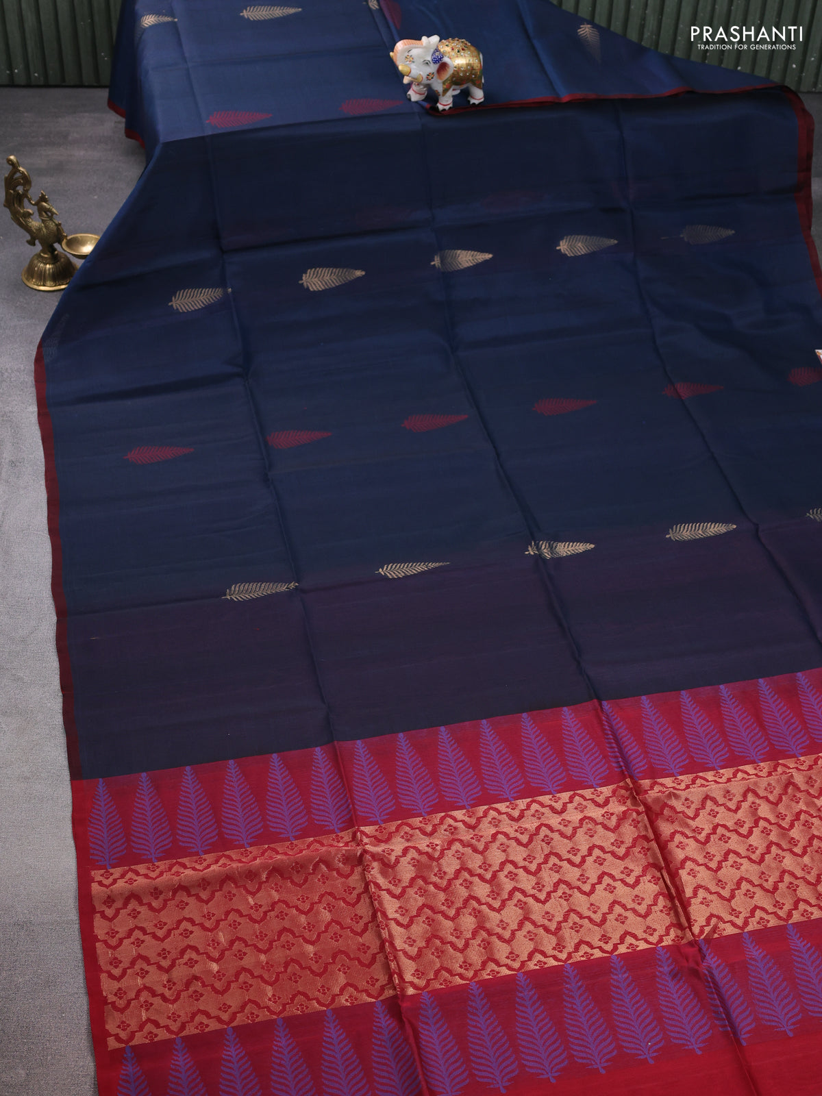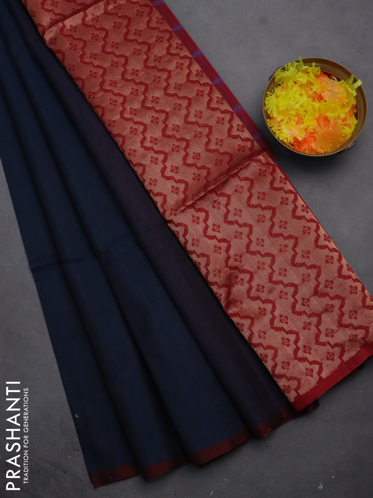 Kora silk cotton saree peacock blue and maroon with thread & zari woven leaf buttas and piping border