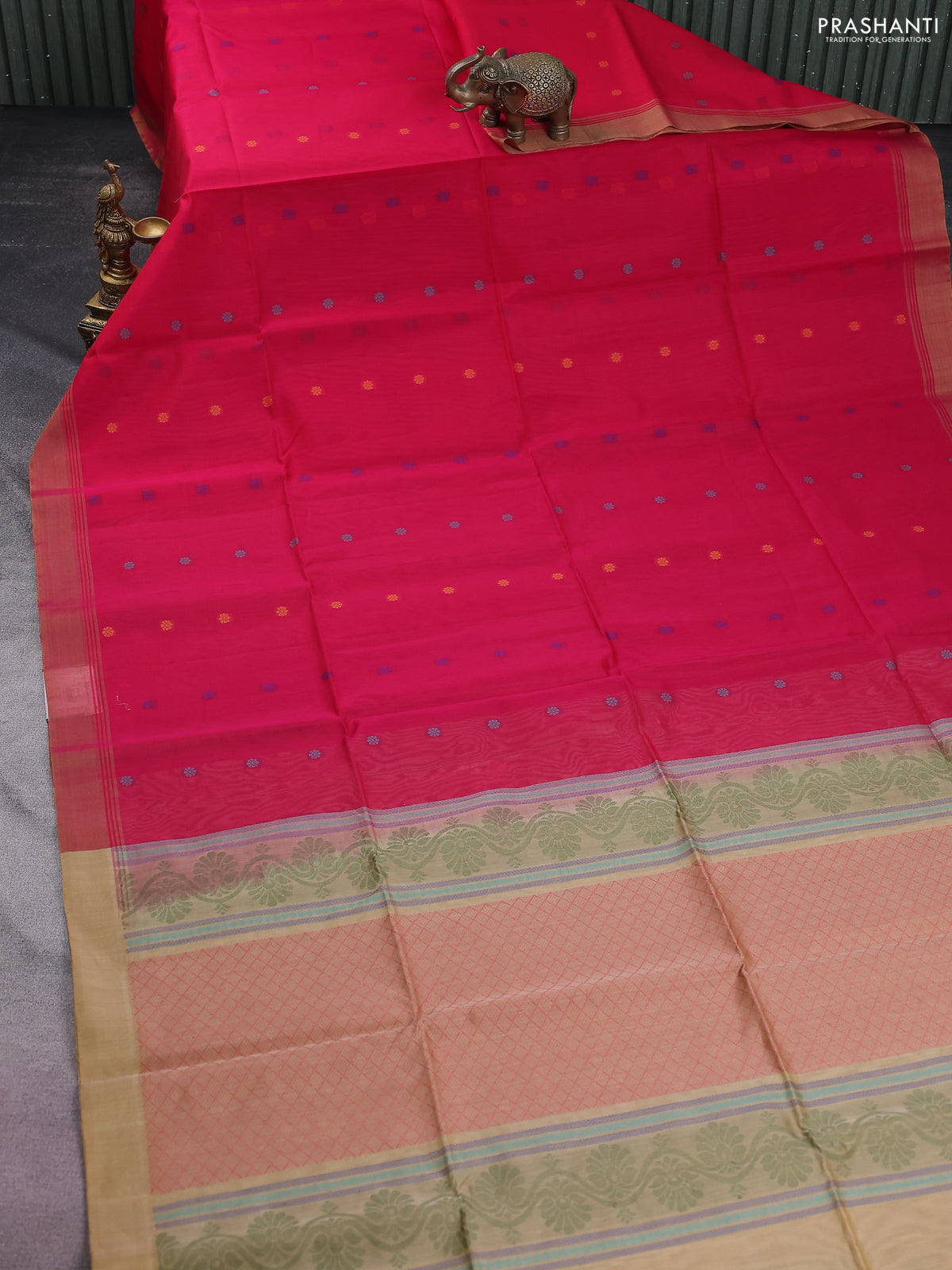Kora silk cotton saree pink and sandal with thread woven floral buttas and simpl border