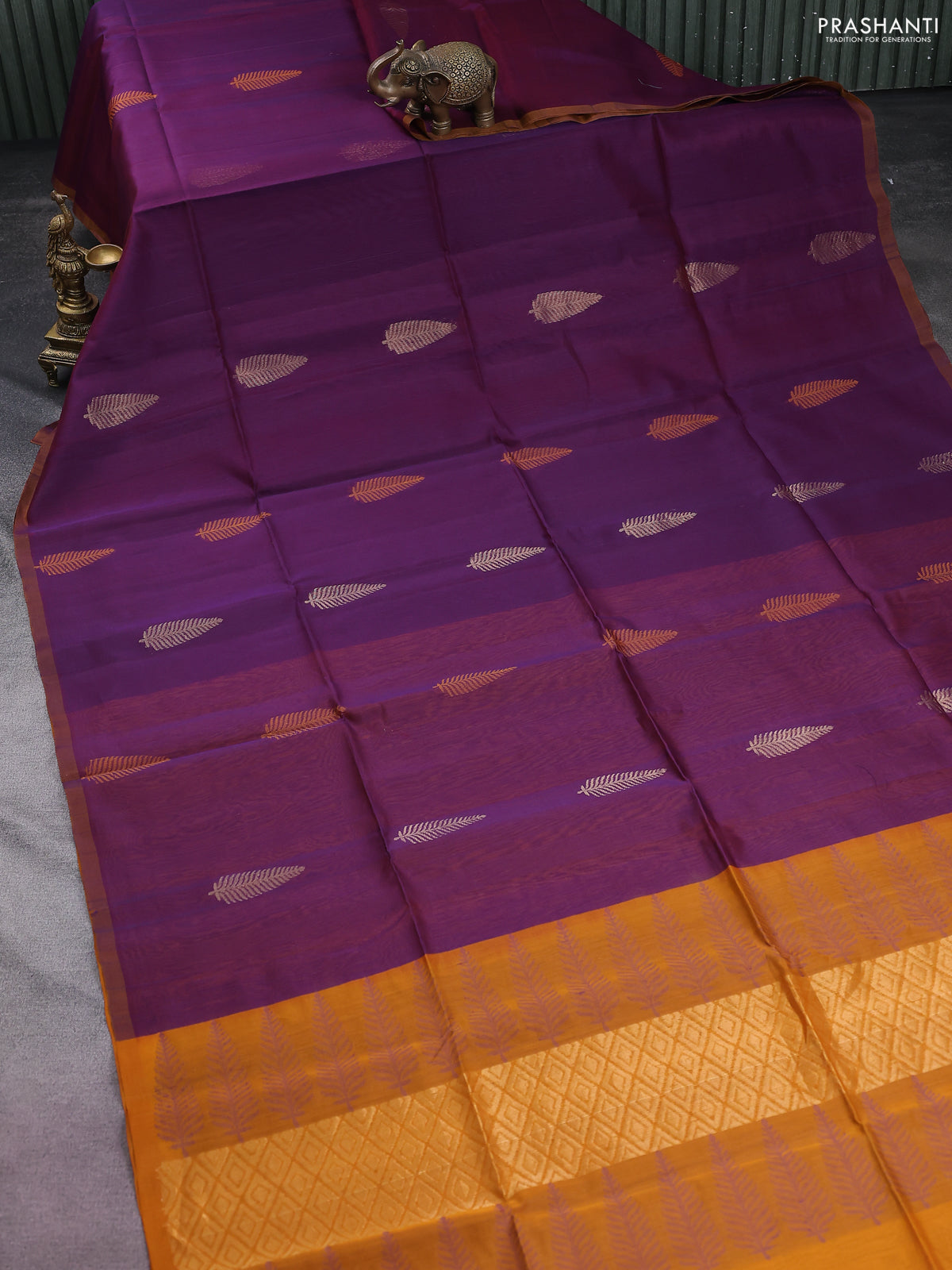 Kora silk cotton saree purple and dark mustard with thread & zari woven leaf buttas and piping border