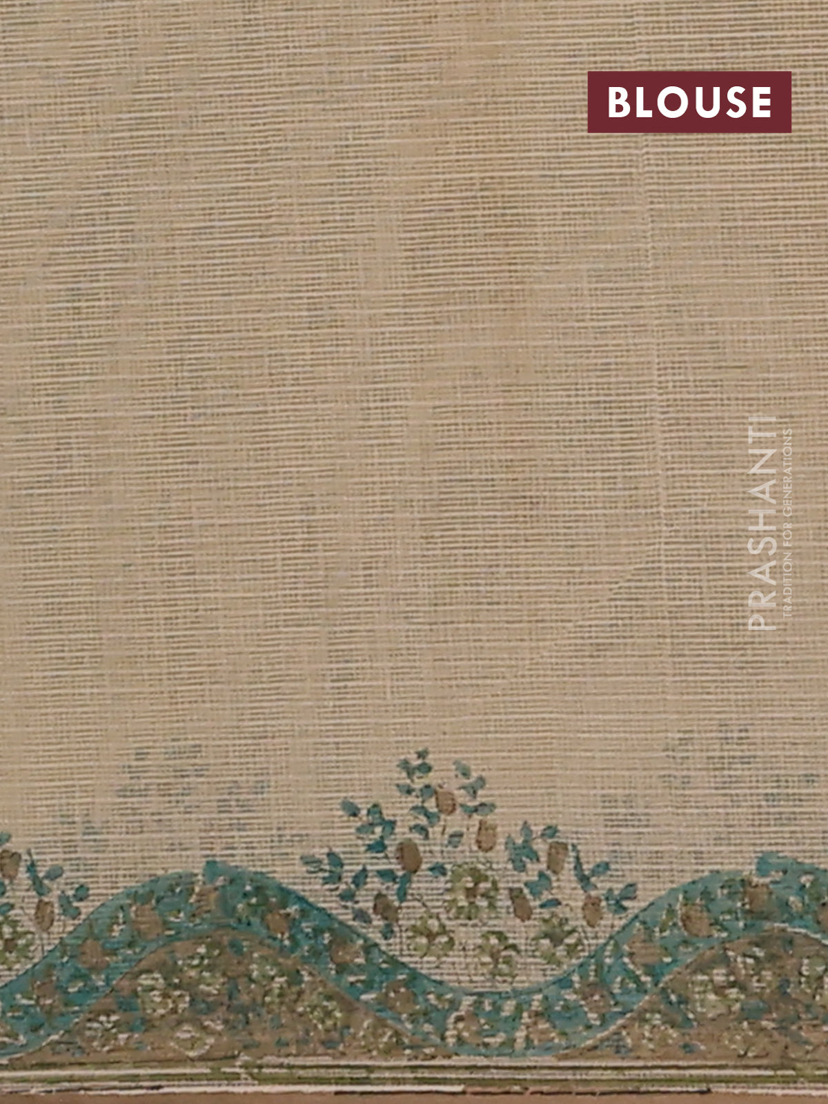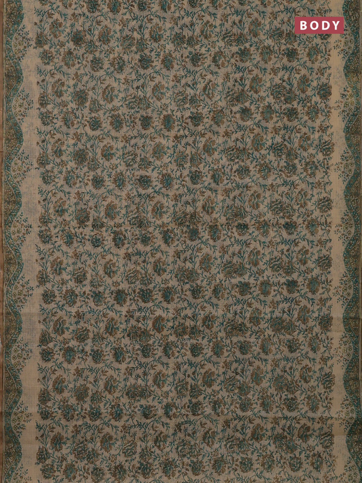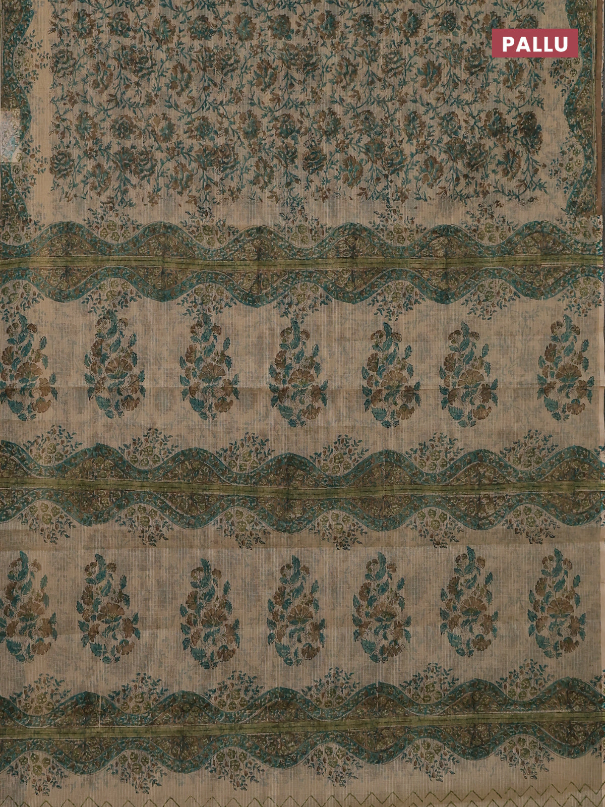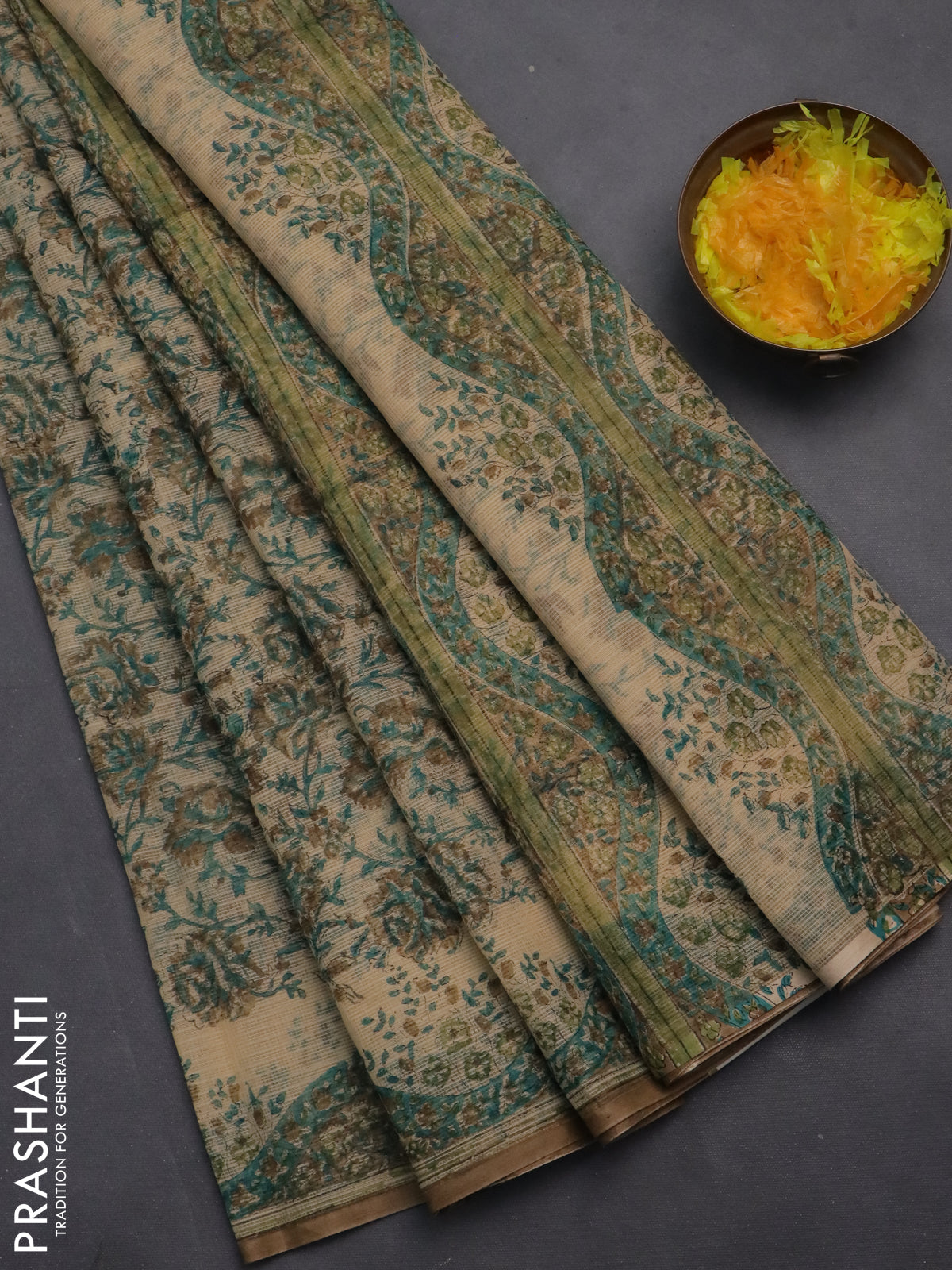 Kota doria saree beige teal green and dark sandal with allover block prints and printed border