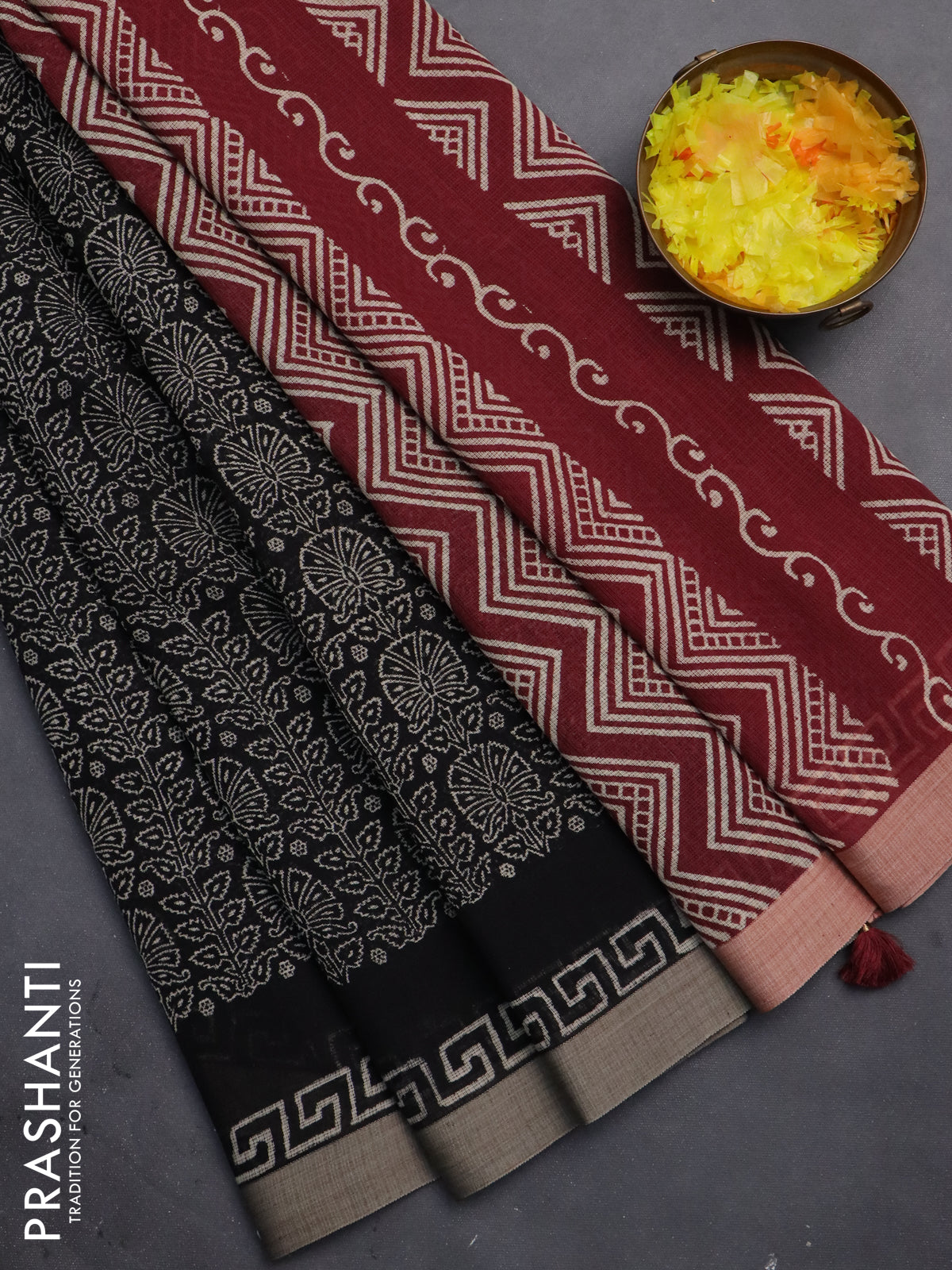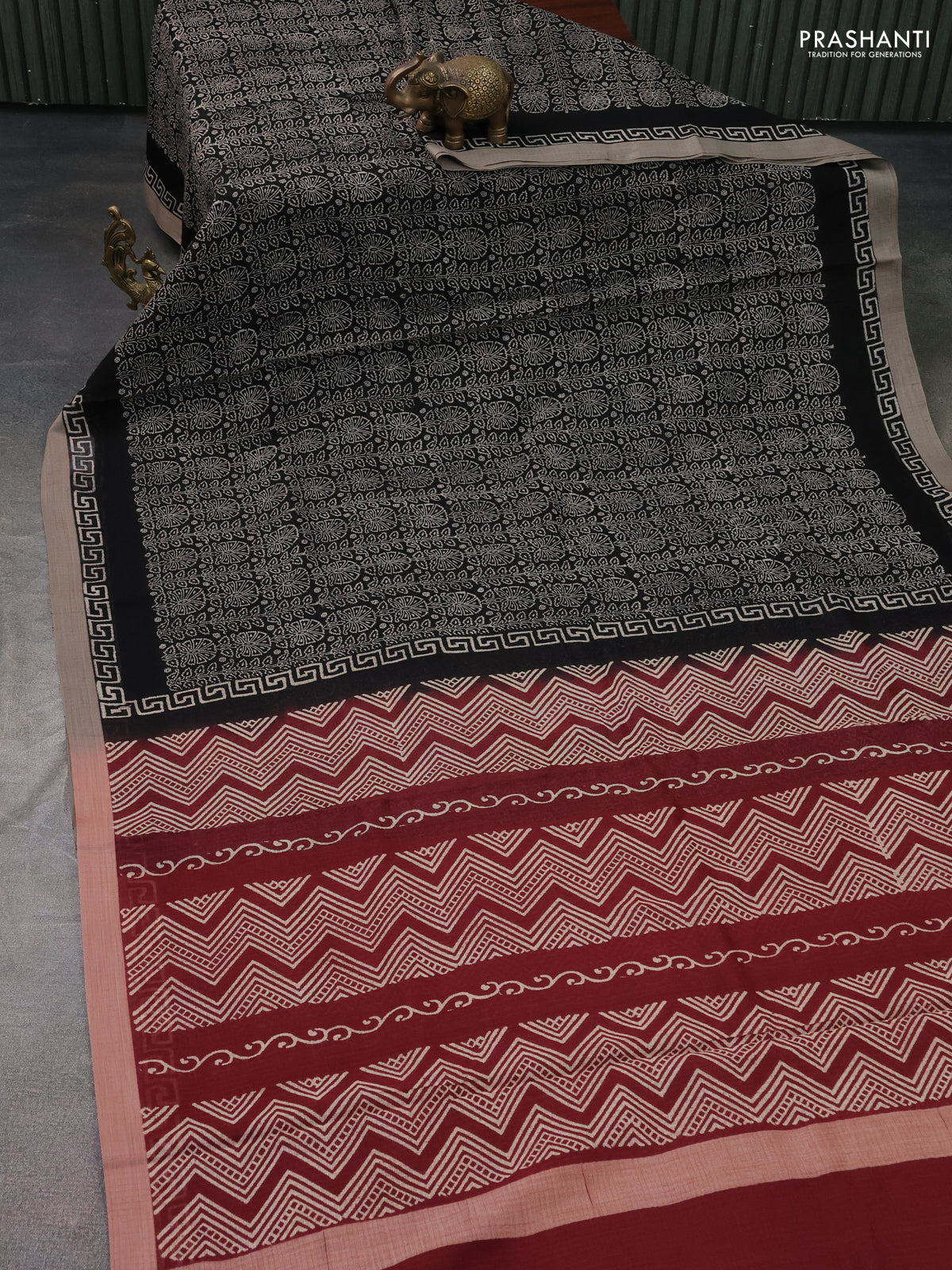 Kota silk cotton saree black and maroon with allover block prints and simple border