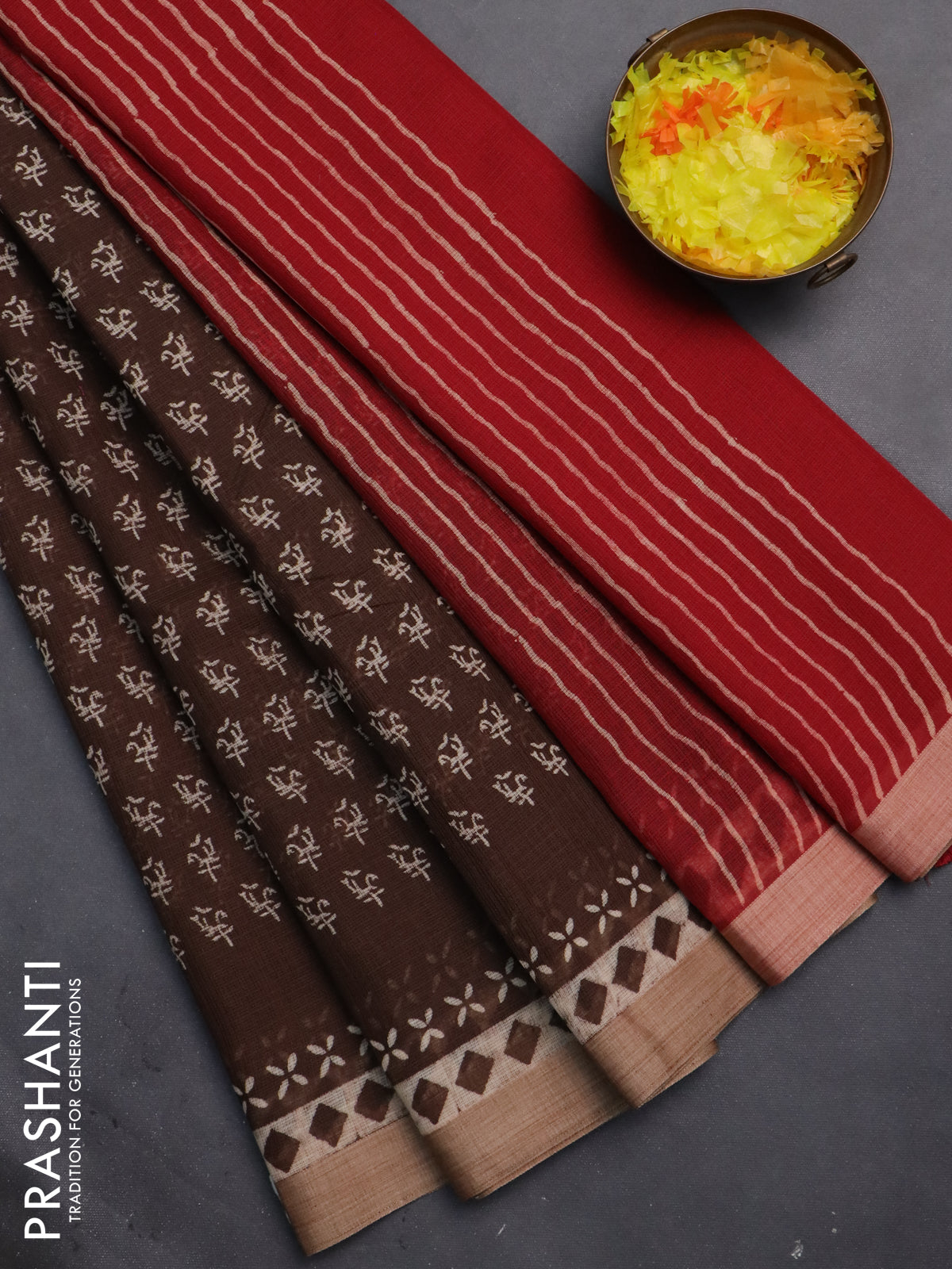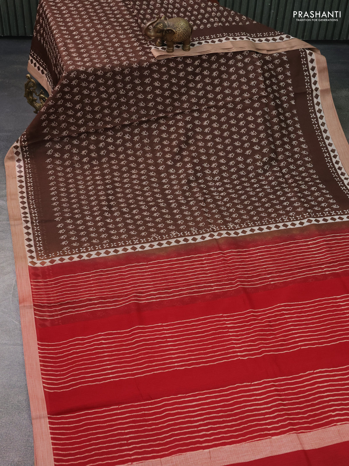 Kota silk cotton saree brown and maroon with allover block prints and simple border