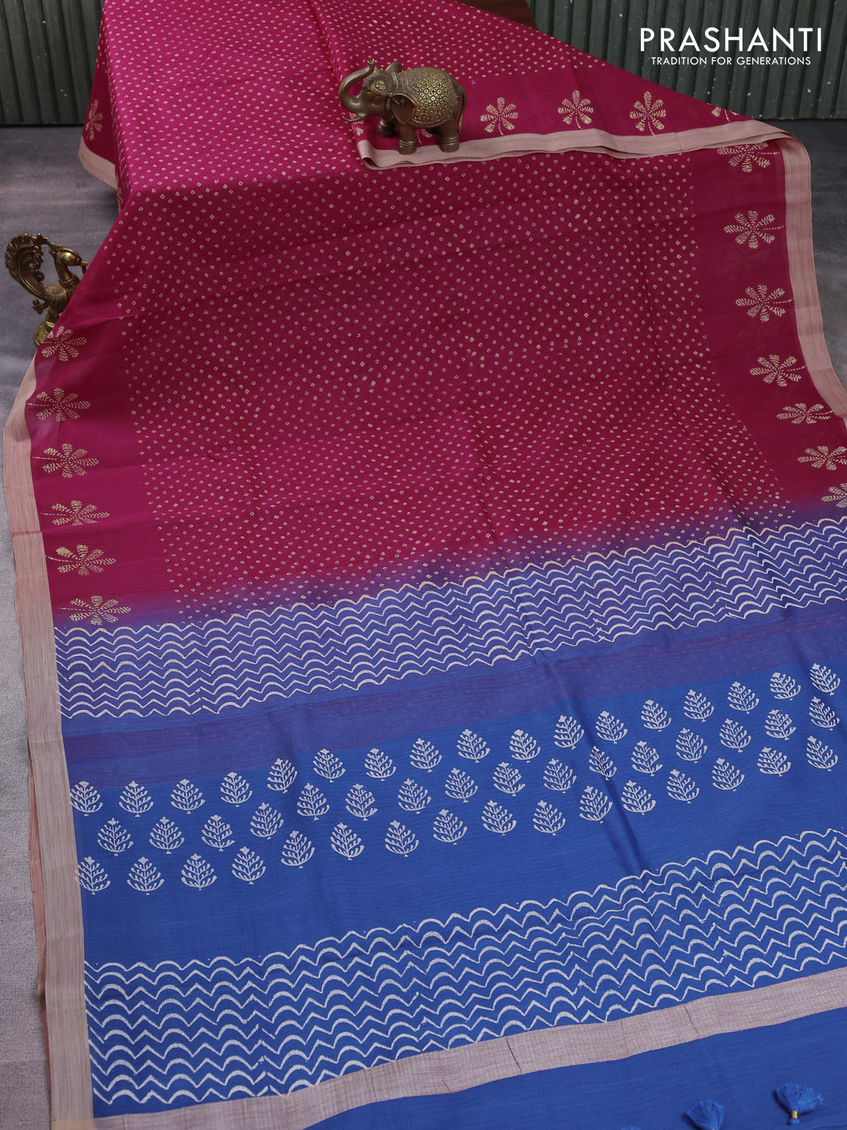 Kota silk cotton saree dark pink and blue with allover block prints and simple border