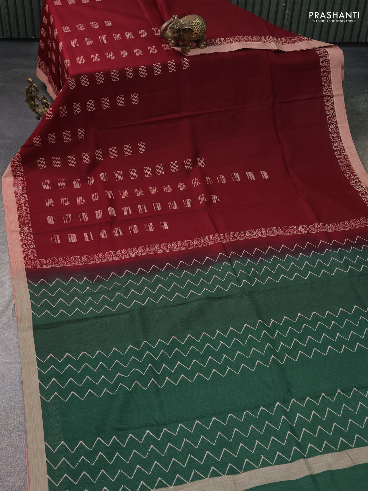 Kota silk cotton saree deep maroon and bottle green with butta block prints and printed border