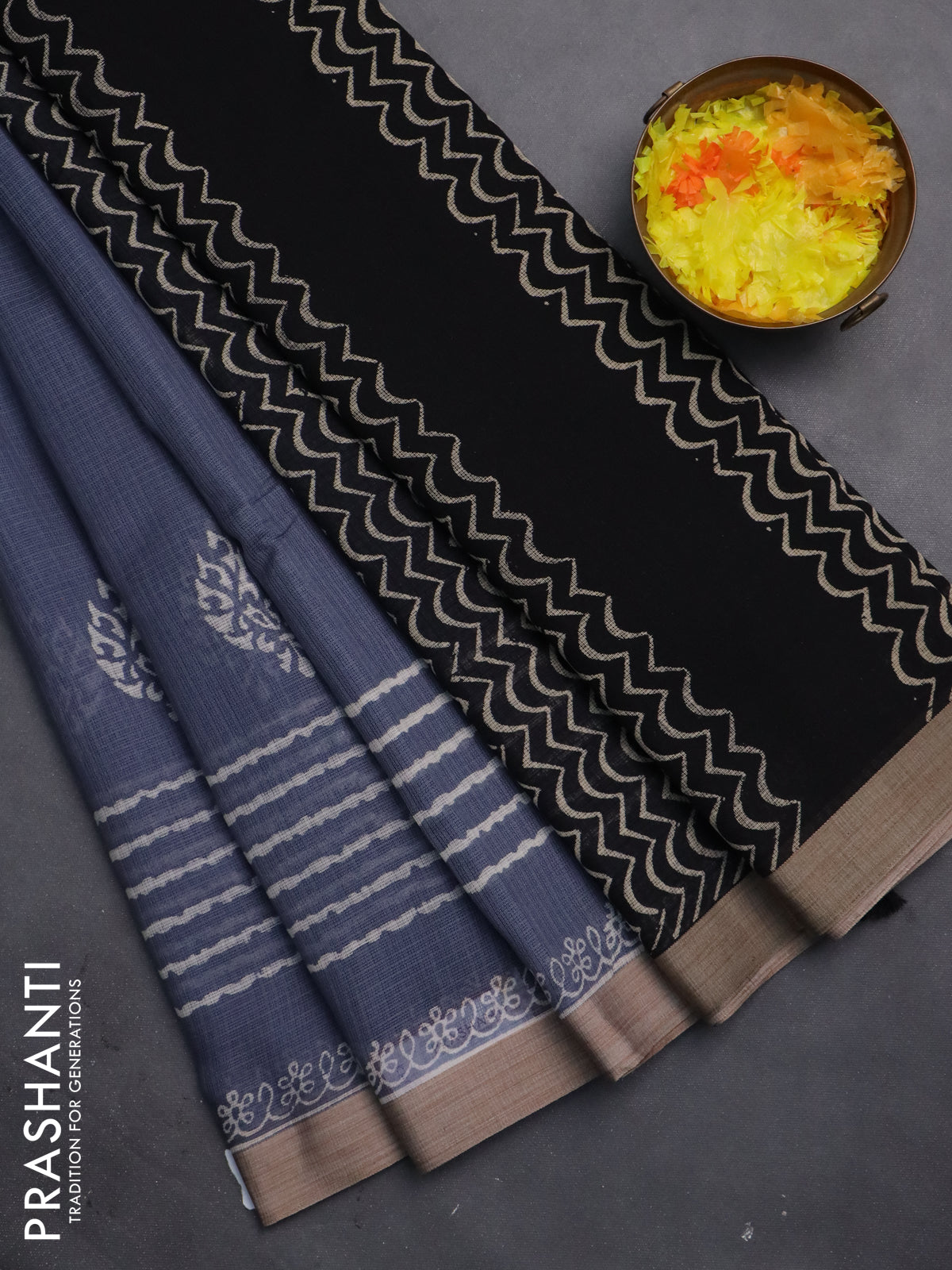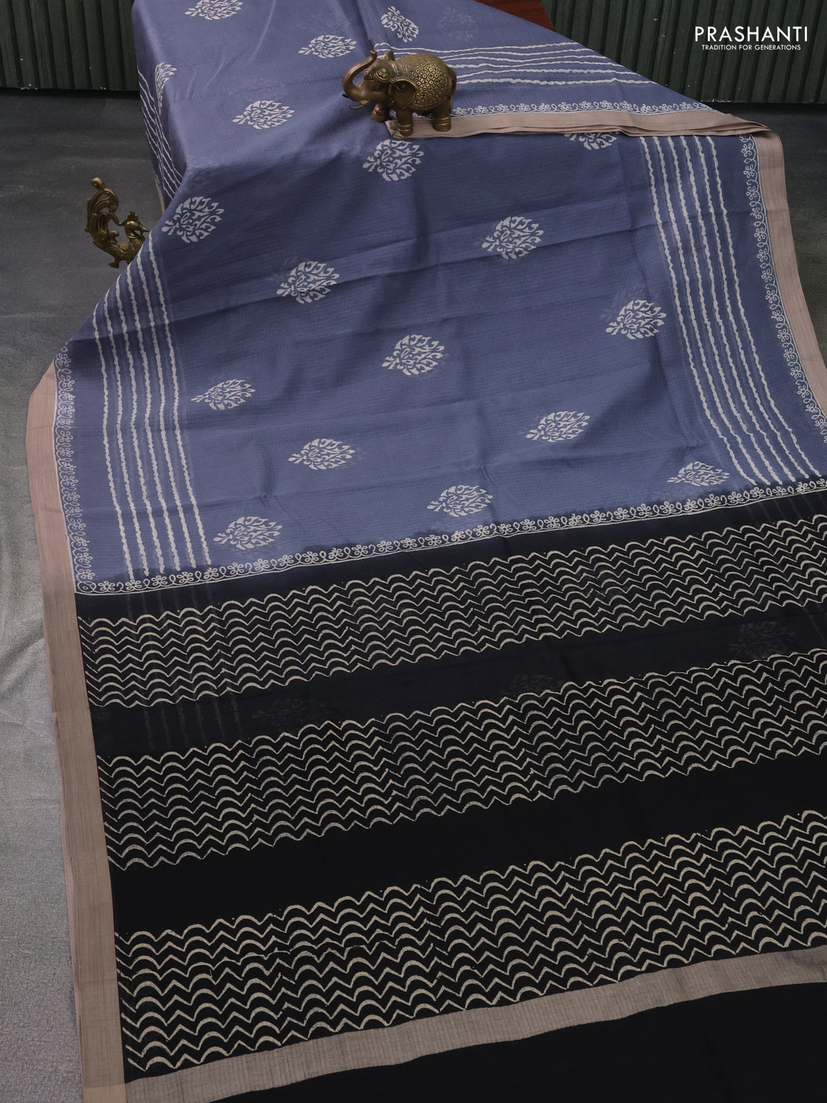 Kota silk cotton saree grey and black with butta block prints and printed border
