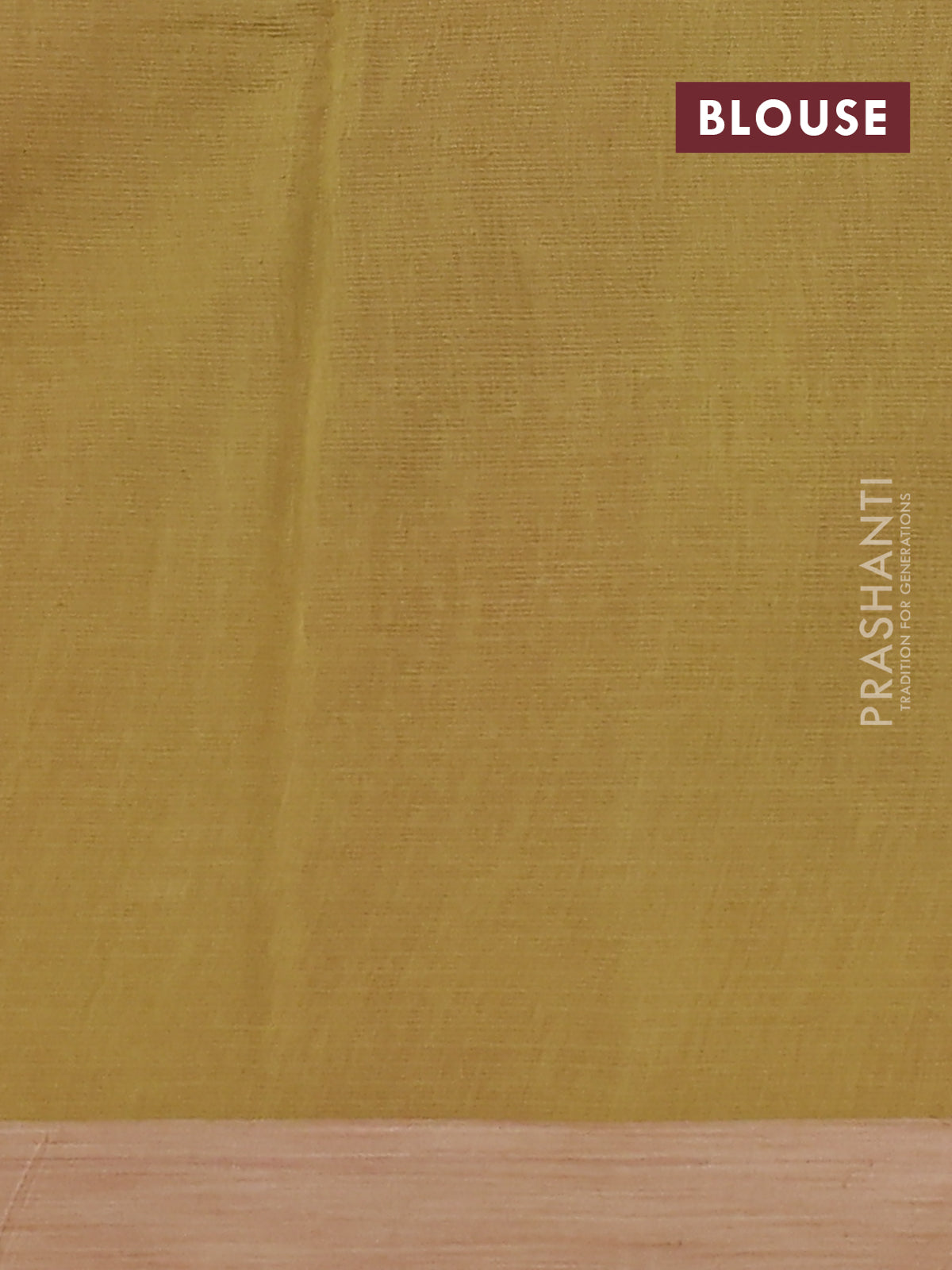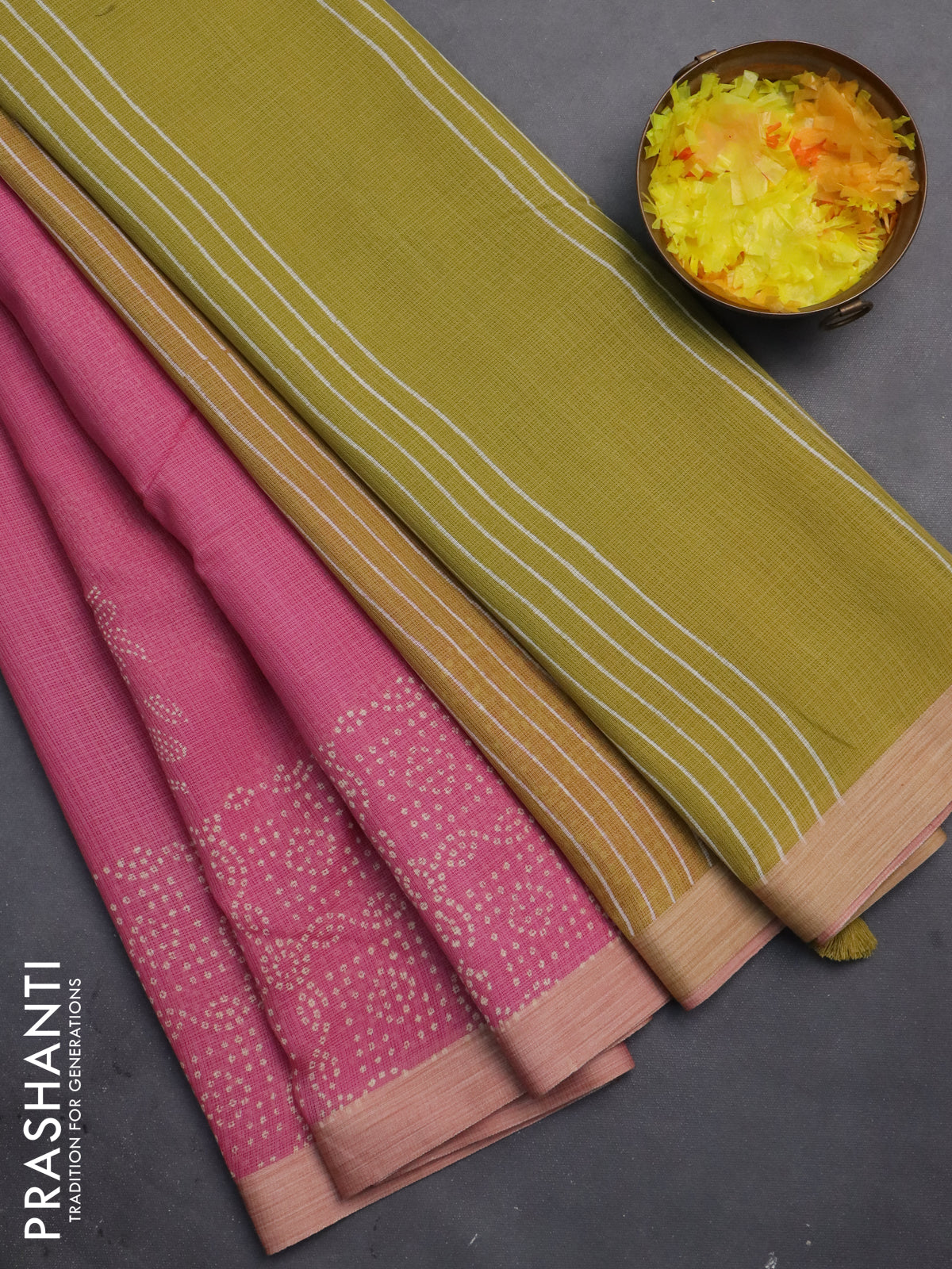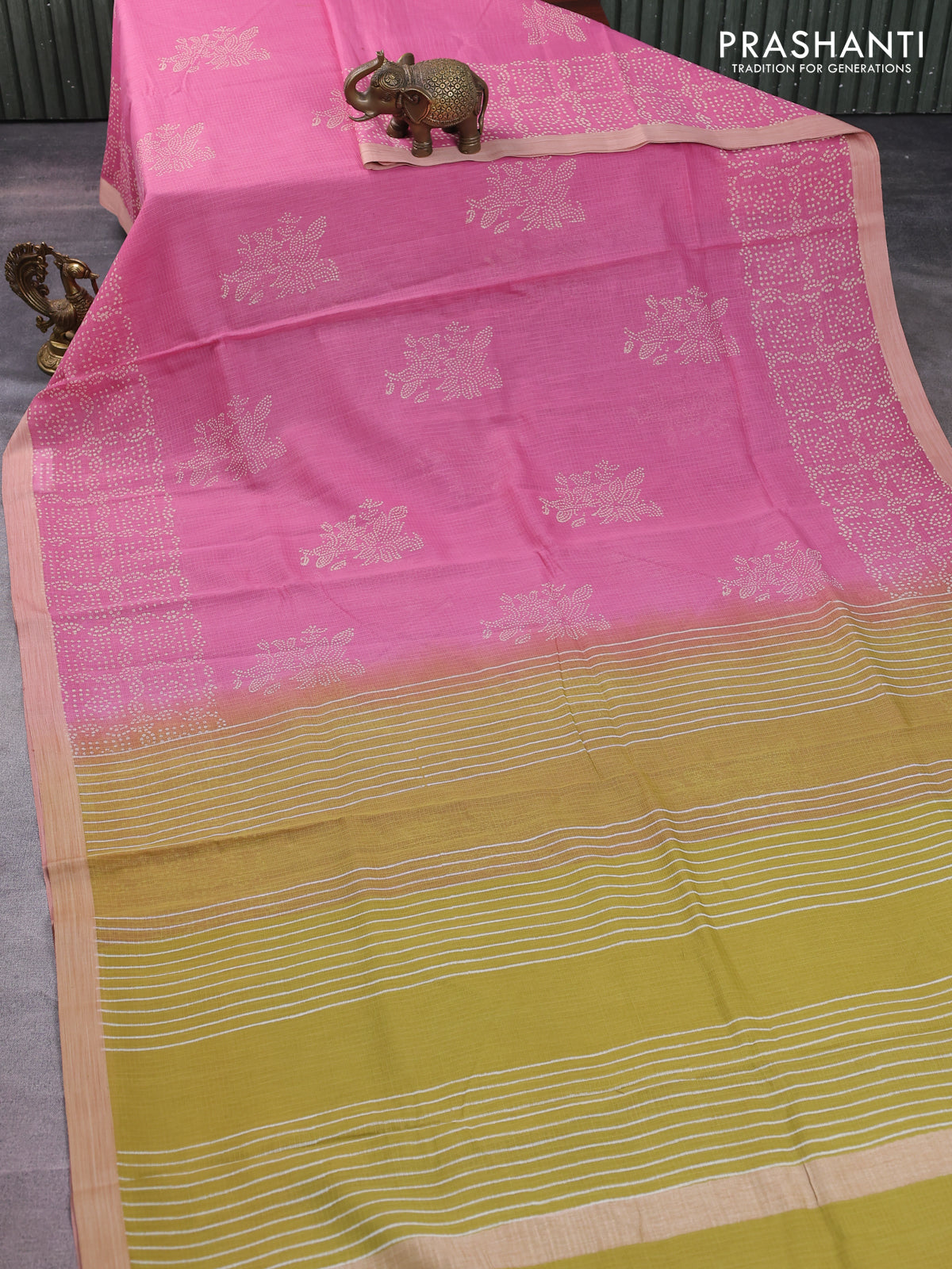 Kota silk cotton saree light pink and mustard yellow with butta block prints and bandhani printed border