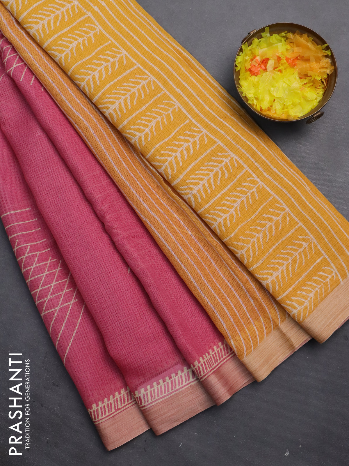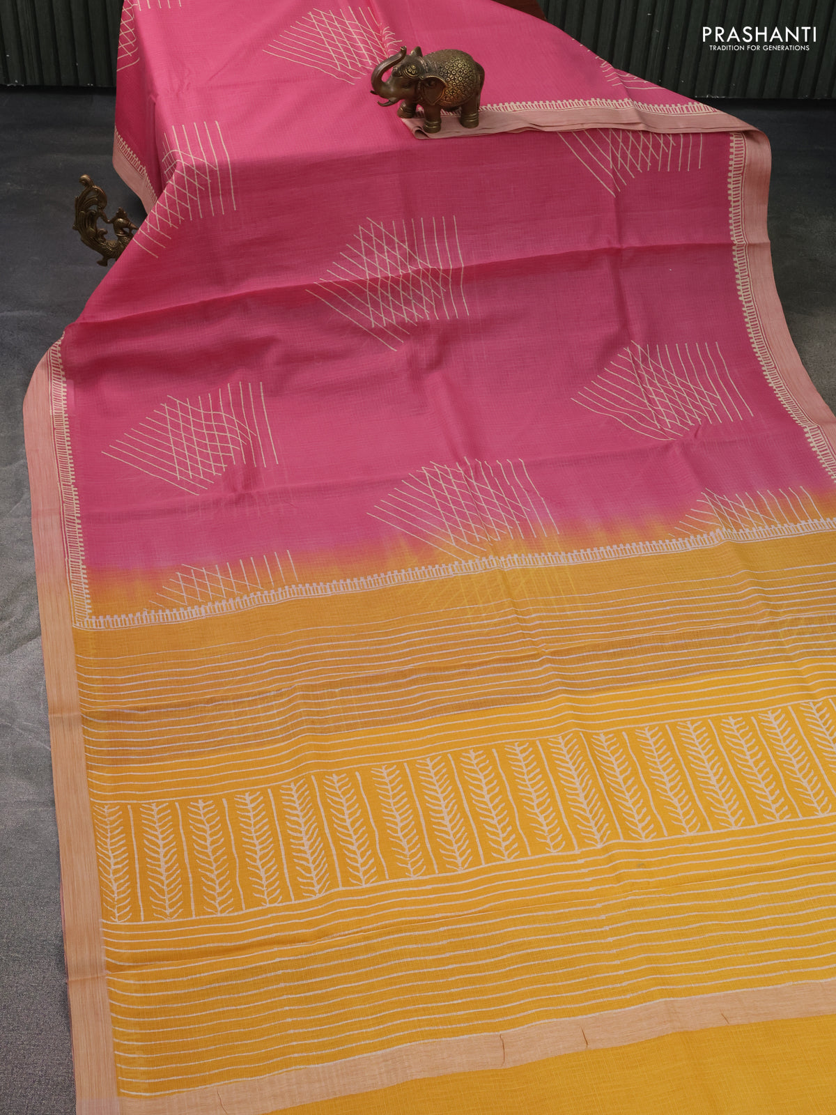 Kota silk cotton saree light pink and yellow with geometric butta block prints and simple border