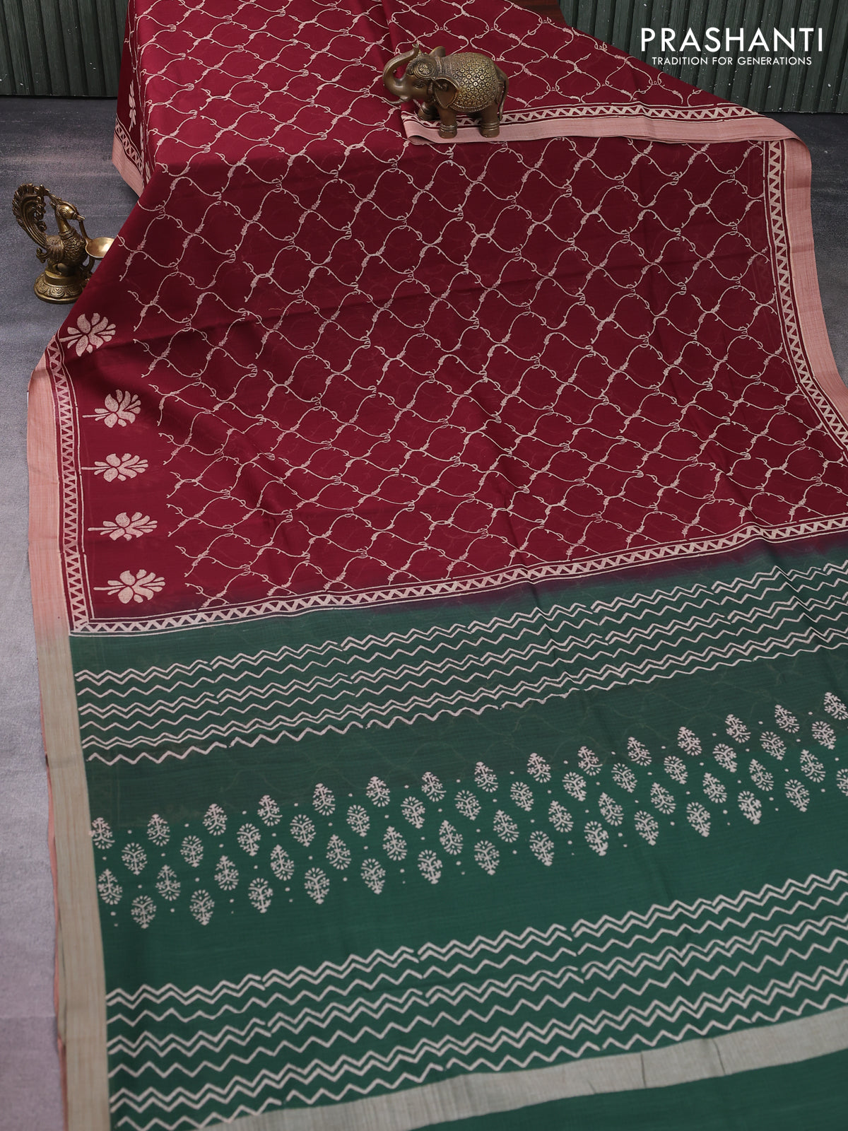 Kota silk cotton saree maroon and green with allover block prints and simple border