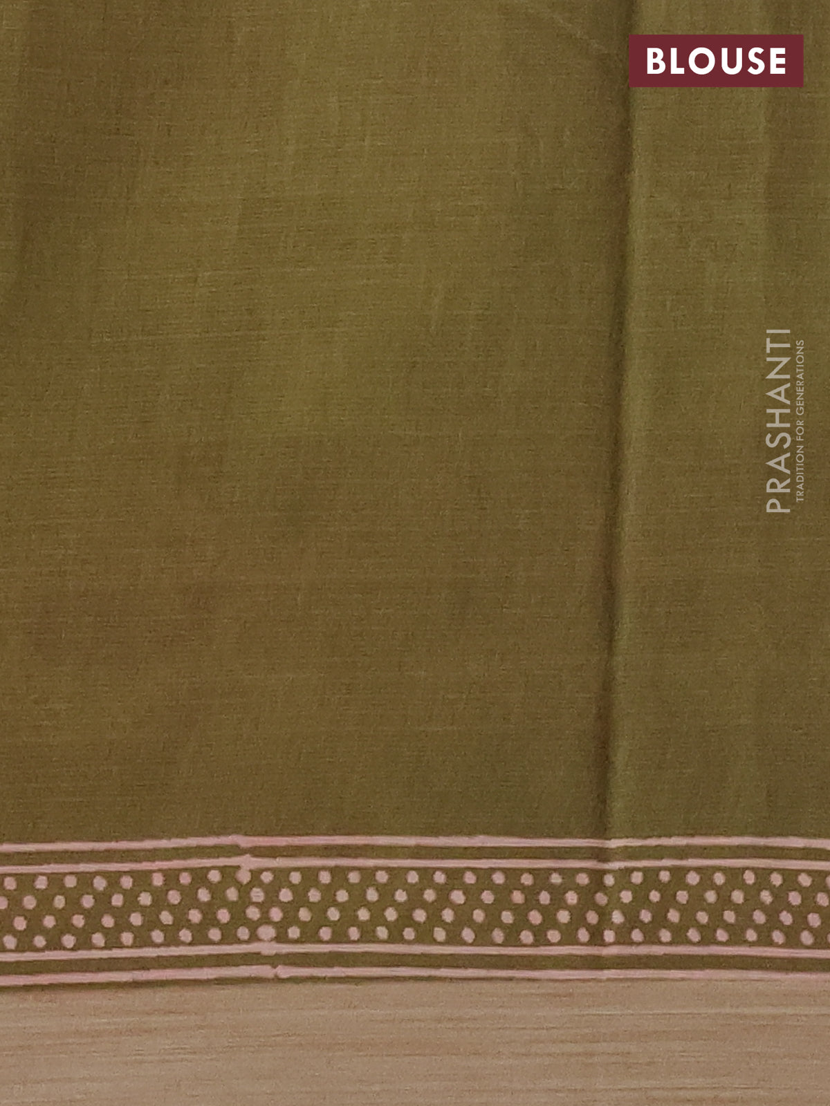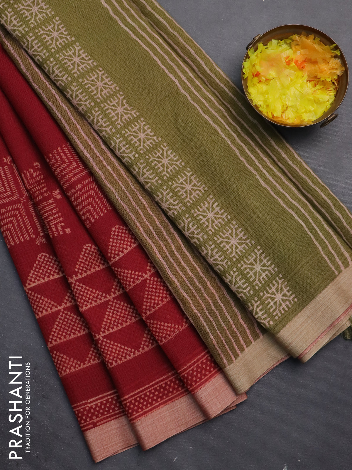 Kota silk cotton saree maroon and olive green with butta block prints and long block printed border