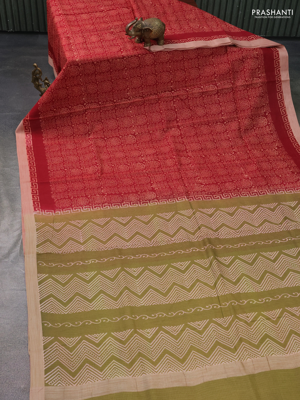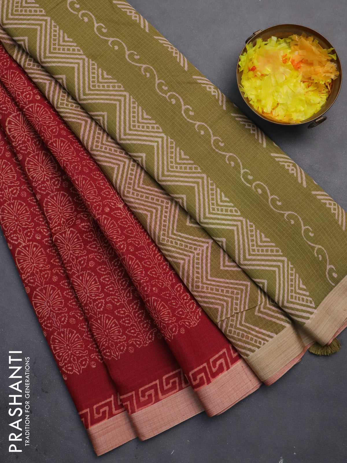 Kota silk cotton saree maroon and sap green with allover block prints and simple border