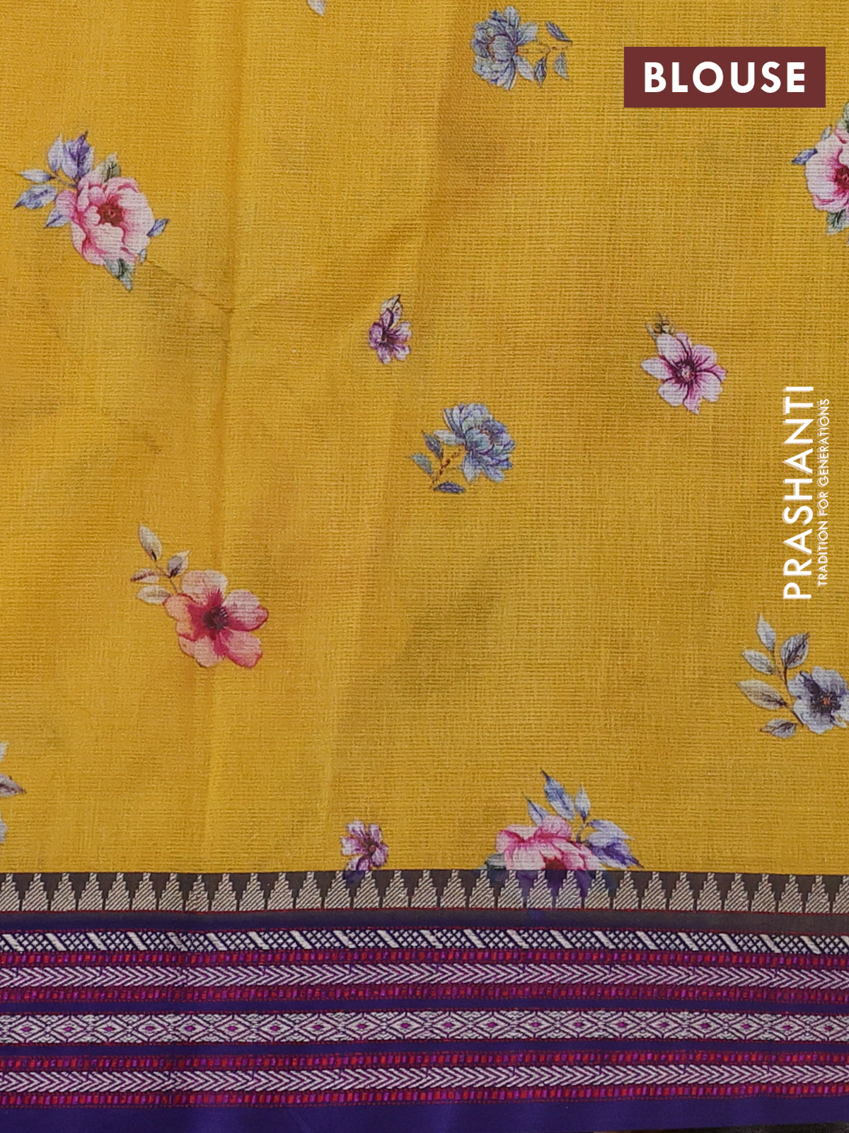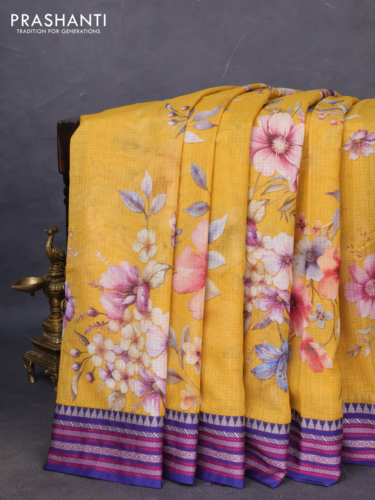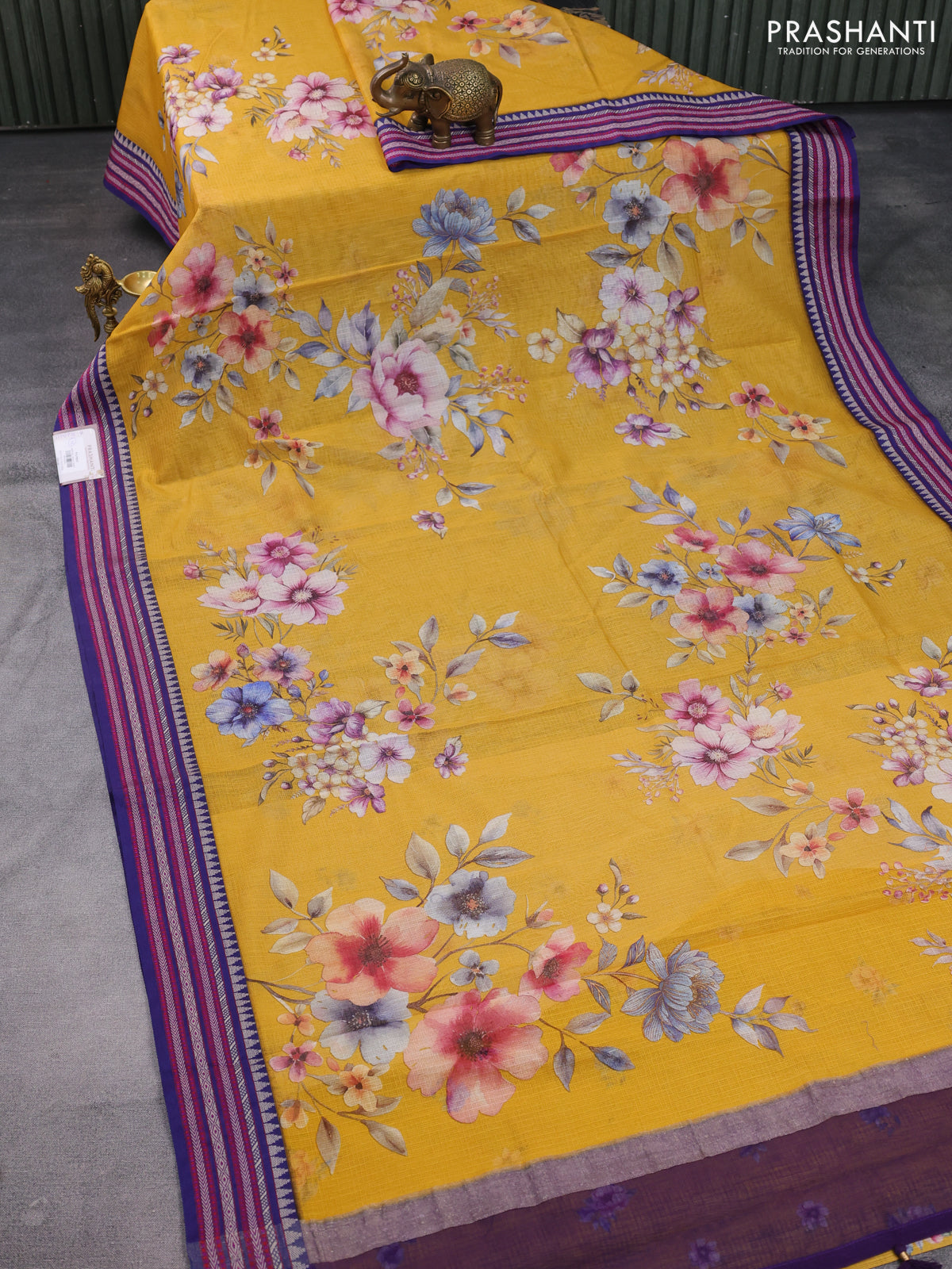 Kota silk cotton saree mustard yellow and blue with allover floral digital prints and woven border