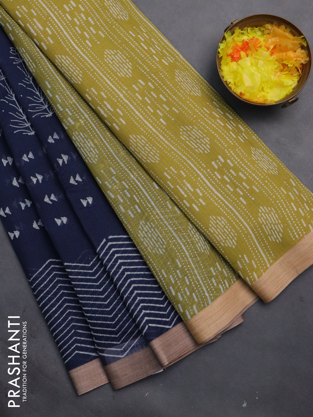 Kota silk cotton saree navy blue and light green with butta block prints and block printed border