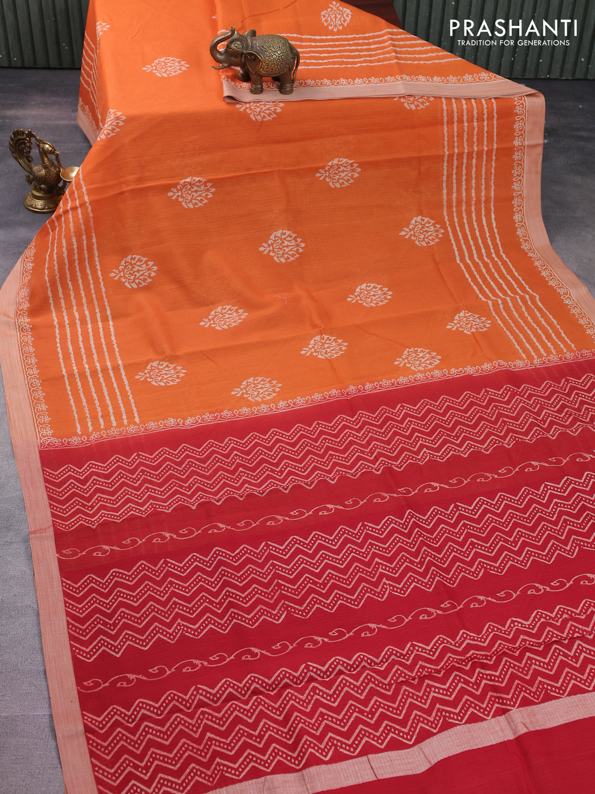 Kota silk cotton saree orange and maroon with butta block prints and printed border