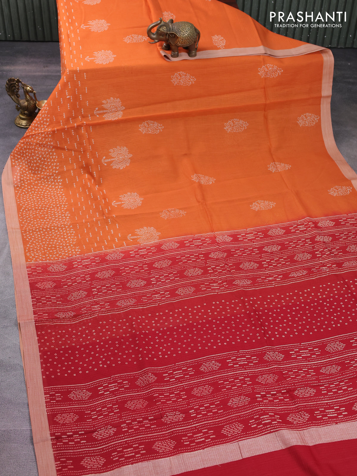 Kota silk cotton saree orange and red with allover block prints and simple border