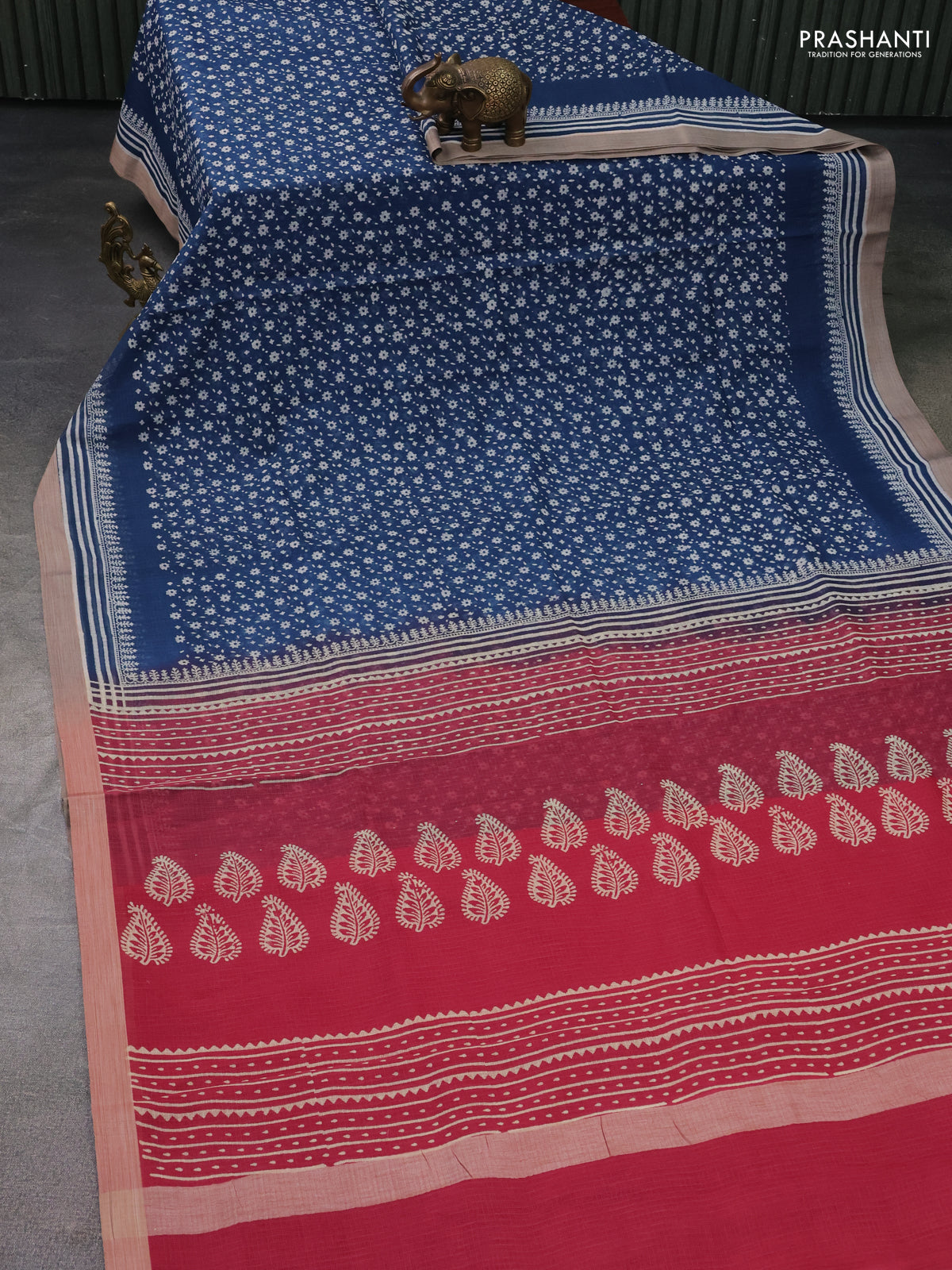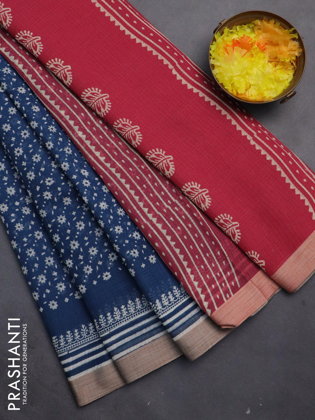 Kota silk cotton saree peacock blue and maroon with allover block prints and simple border