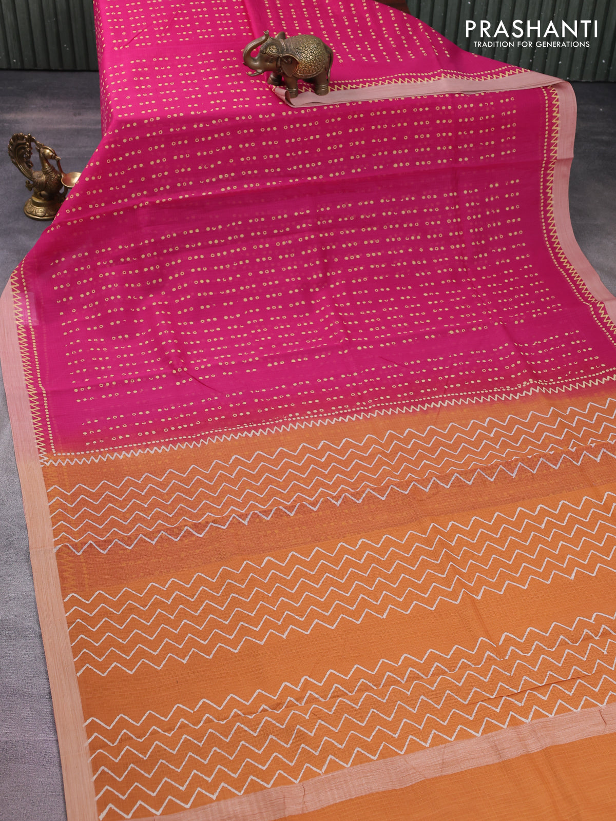Kota silk cotton saree pink and pale orange with allover block prints and simple border