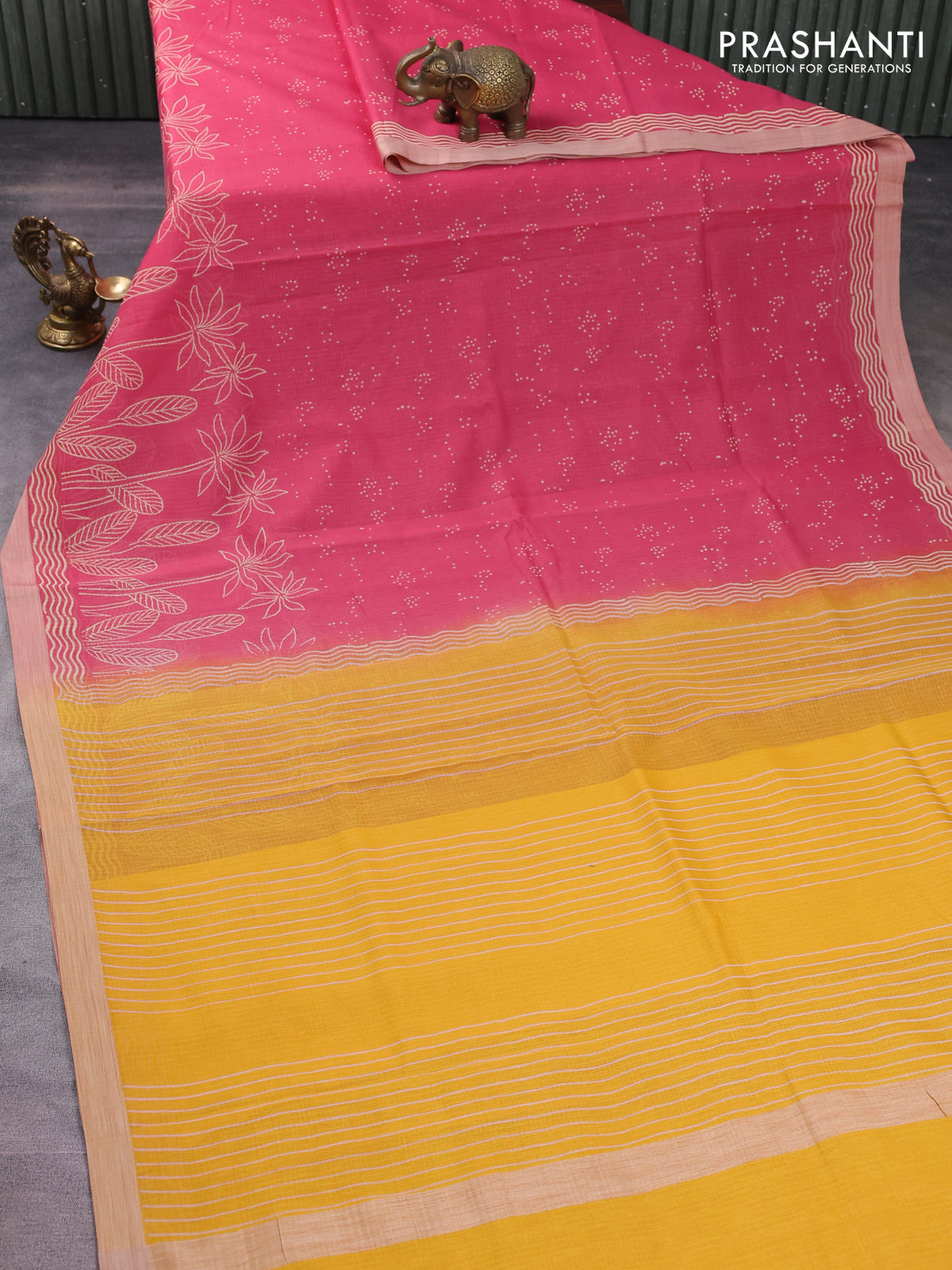 Kota silk cotton saree pink and yellow with allover block prints and long block printed border