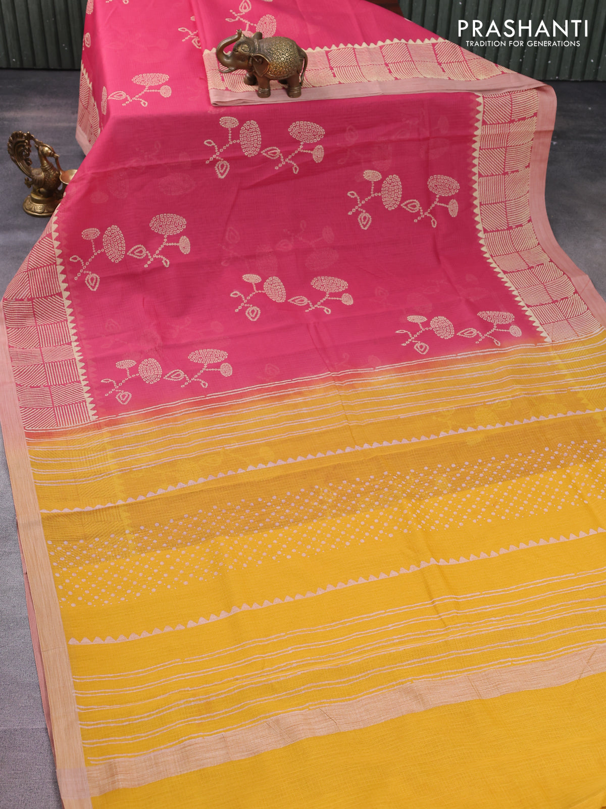 Kota silk cotton saree pink and yellow with butta block prints and printed border