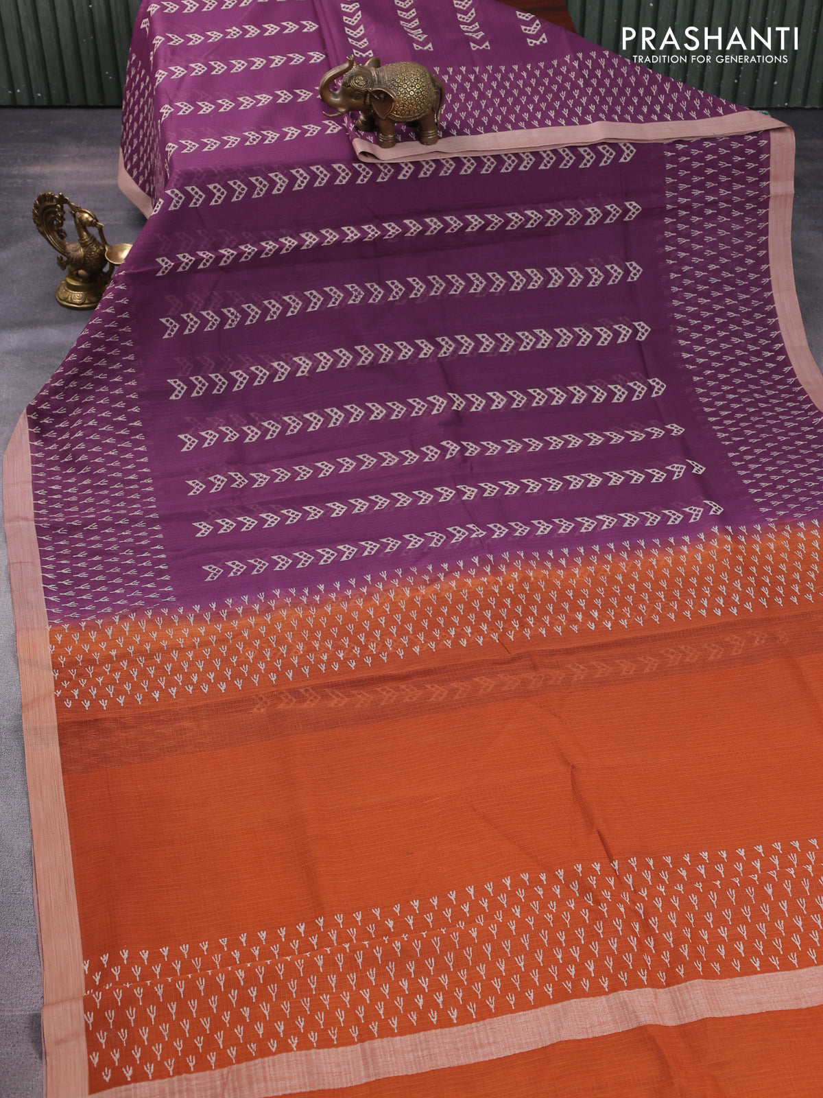 Kota silk cotton saree purple and rust shade with allover block prints and printed border