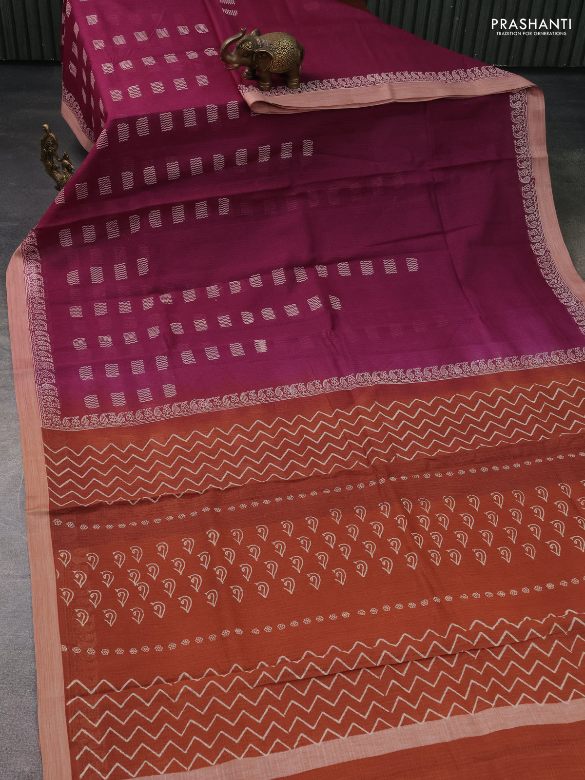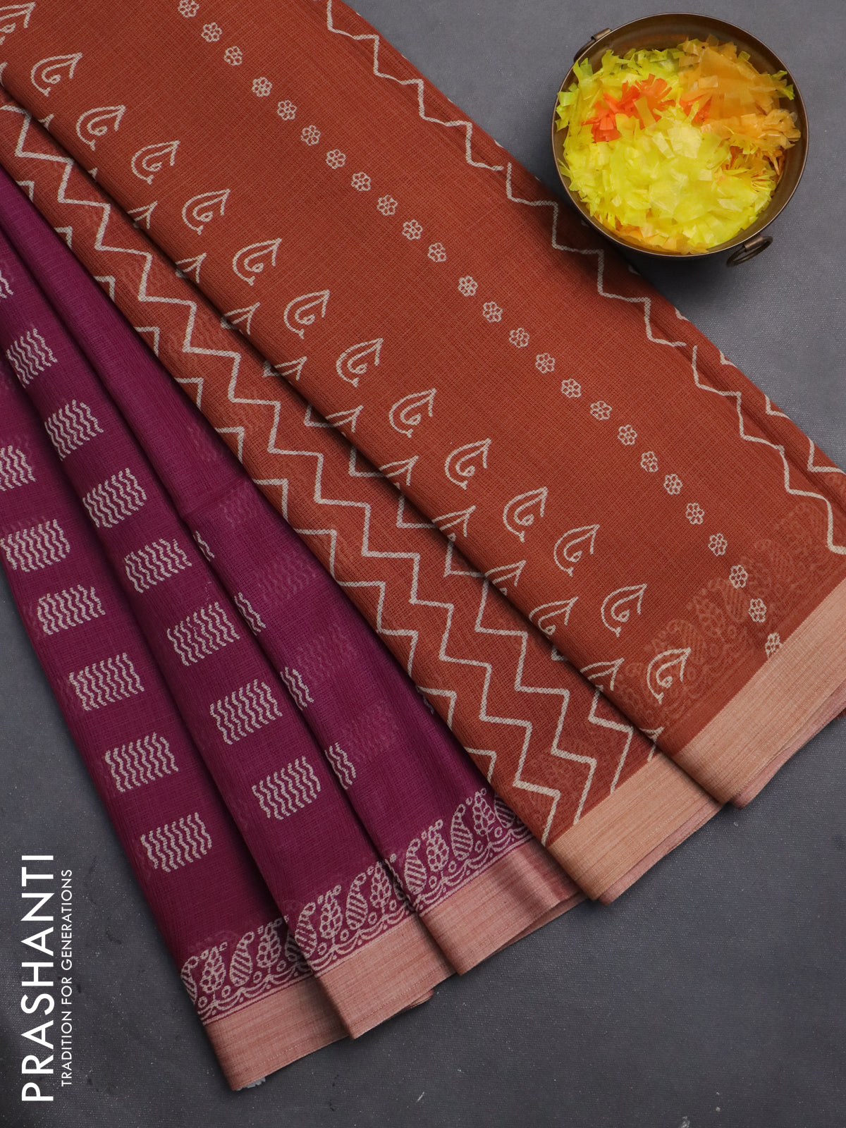 Kota silk cotton saree purple and rust shade with butta block prints and printed border