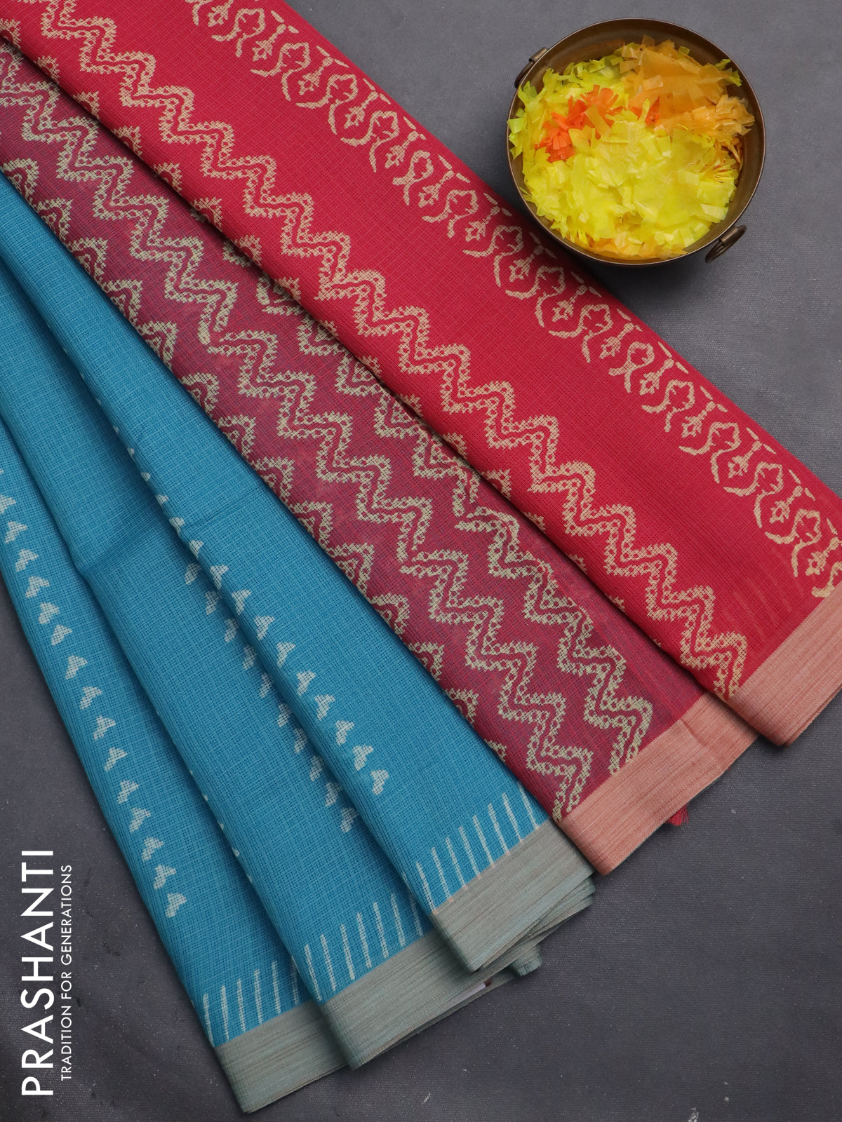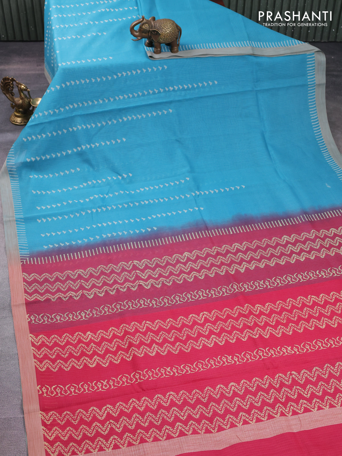 Kota silk cotton saree teal blue and peach pink with allover block prints and simple border
