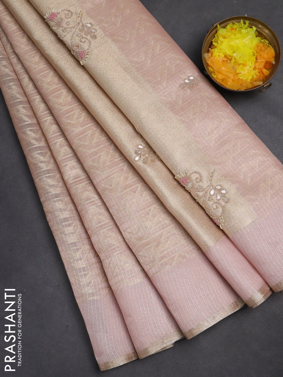 Kota tissue saree baby pink with allover zari weaves and embroidered butta boder