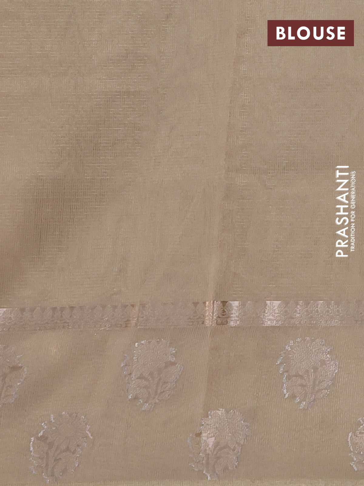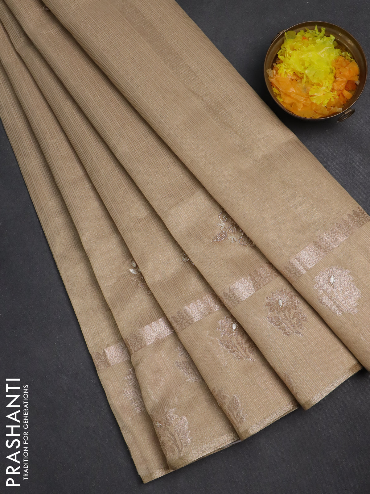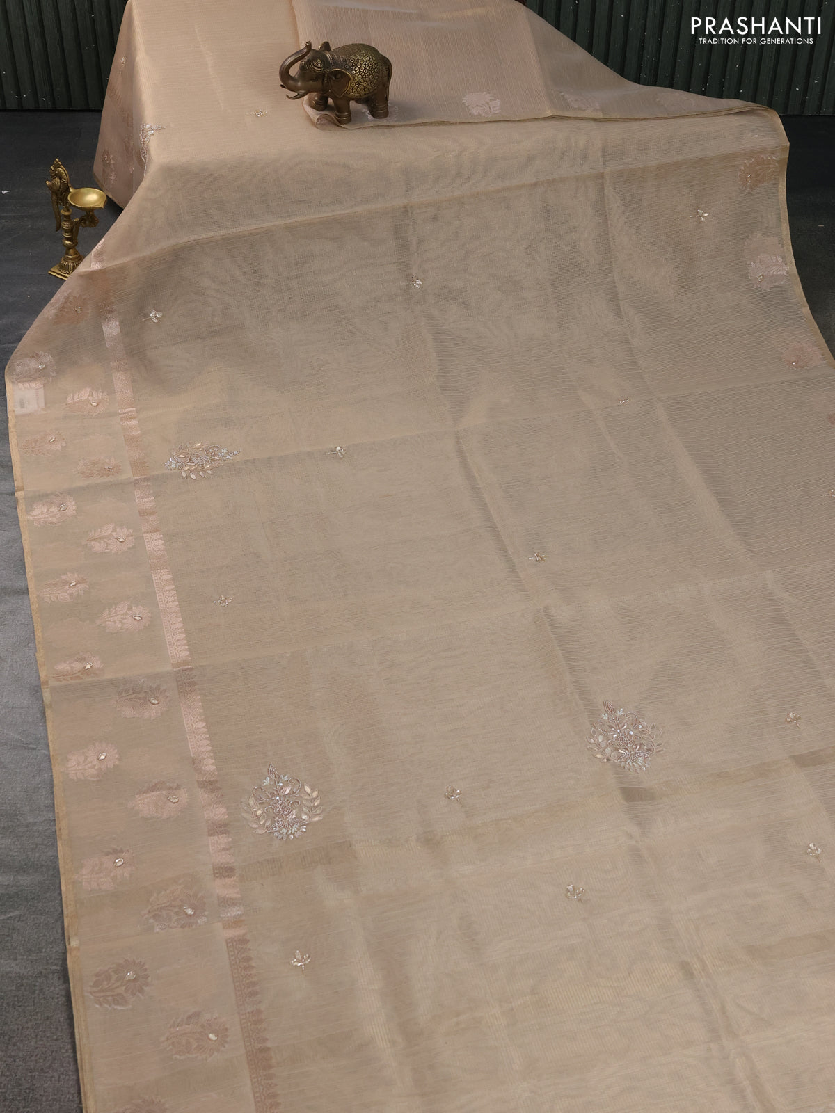 Kota tissue saree beige with embroidery buttas and zari woven butta border