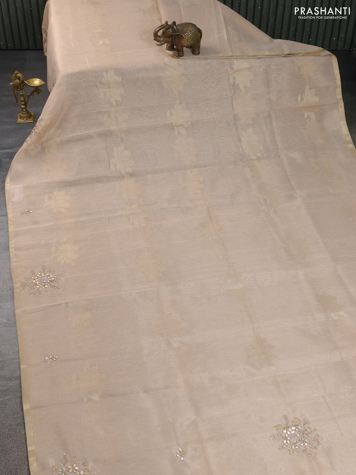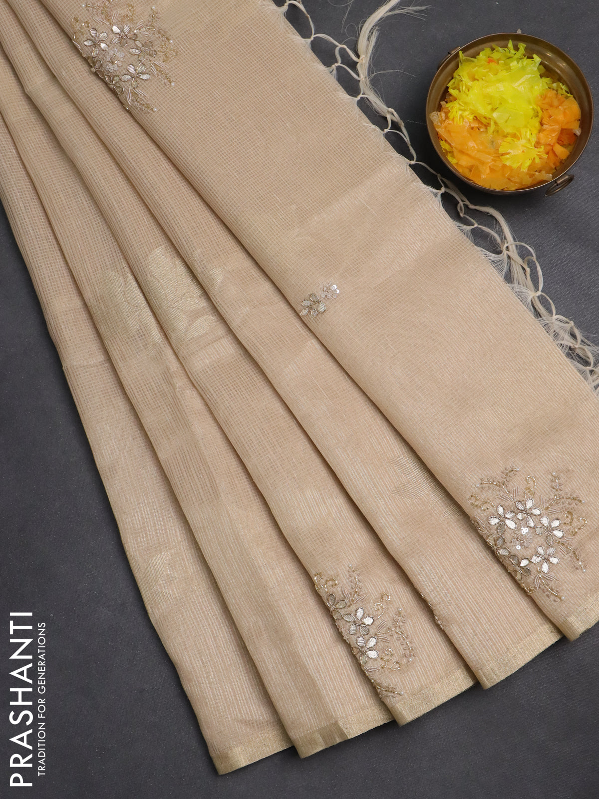 Kota tissue saree beige with zari woven floral buttas and embroidery butta border