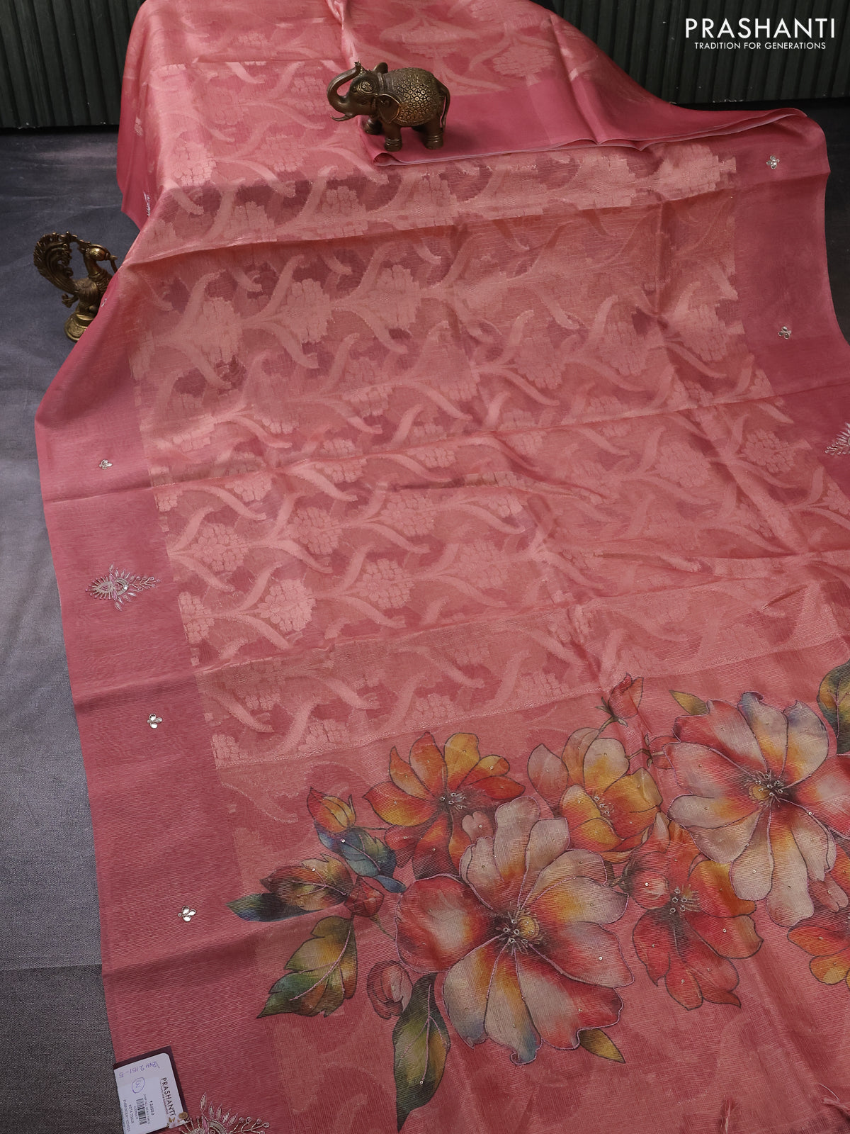 Kota tissue saree dark peach with floral prints & pita work and zardosi work butta border